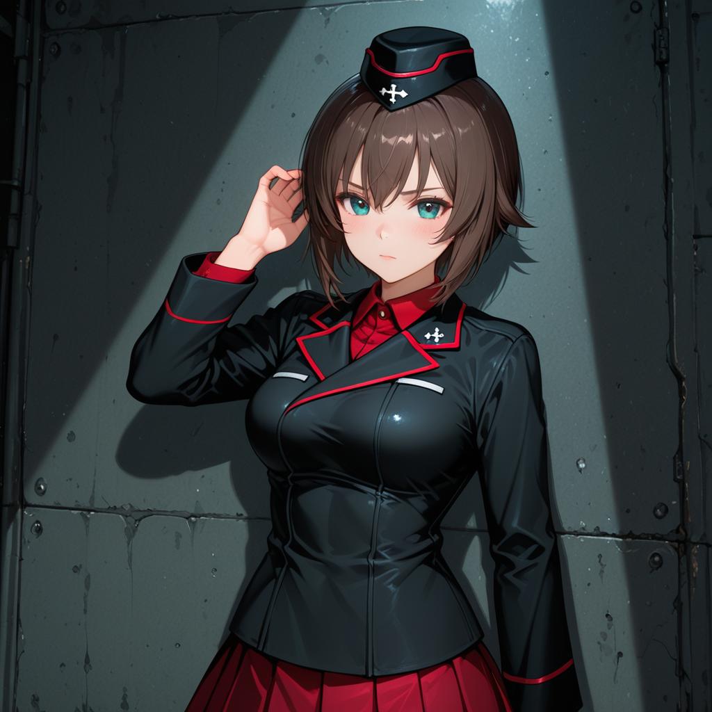Hida ema, girls und panzer, 1girl, blue eyes, short hair, brown hair, medium breasts, kuromorimine military uniform, military uniform, kuromorimine military uniform, black jacket, dress shirt, garrison cap, red shirt, military uniform, pleated skirt, long sleeves, wing collar, insignia, by artist nakasone haiji, dark_illustrious