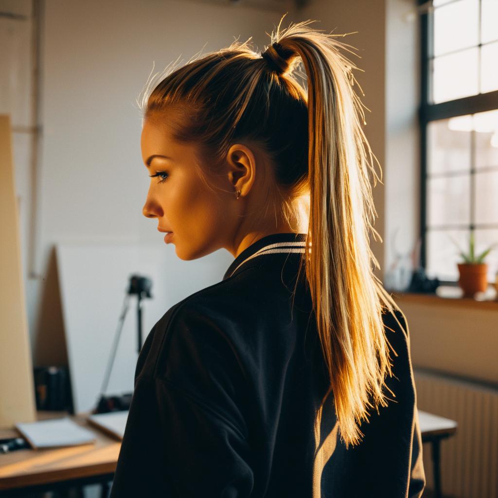 Classic Ponytail hairstyle on fashion model, wearing sleek leather jacket and denim, in runway, captured in fashion editorial style with moody sunset glow.