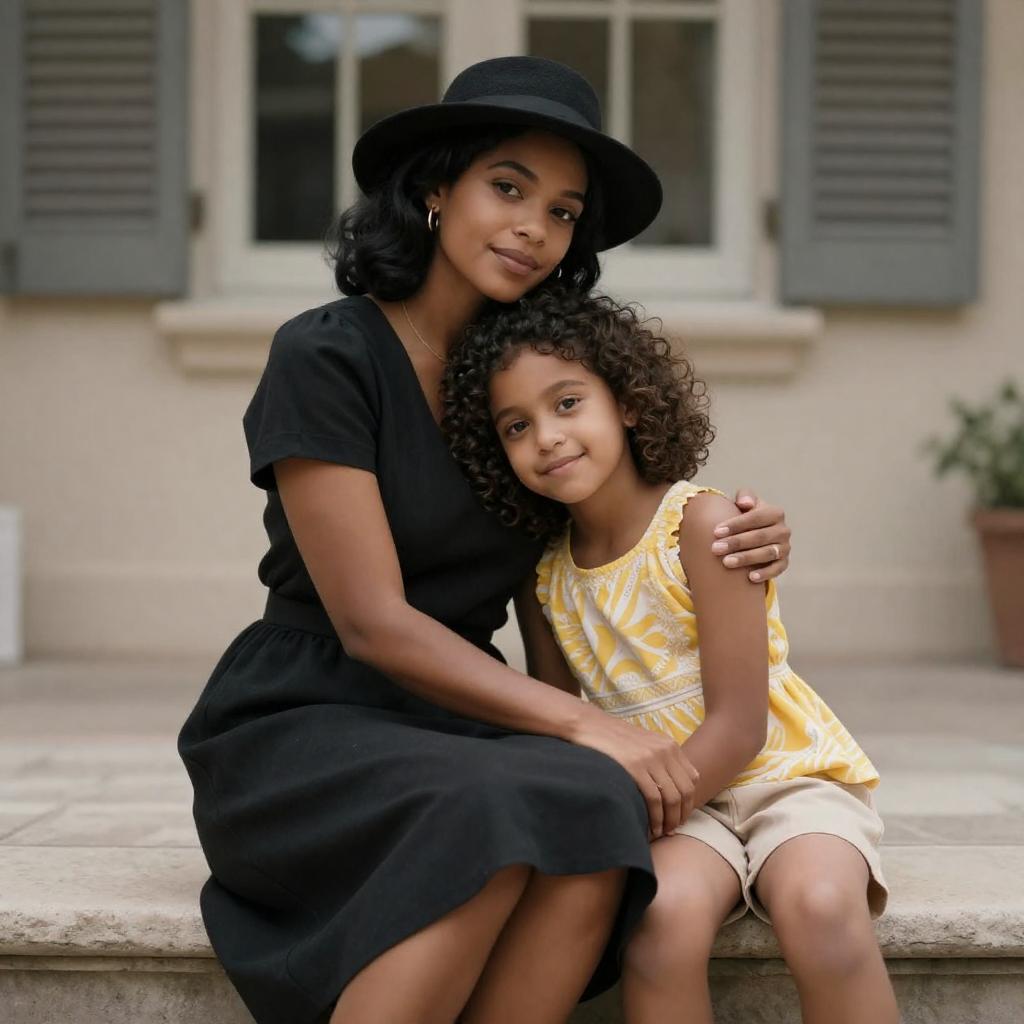Photograph of a woman with dark skin and black hair in a vintage-style black dress and hat, embracing a young girl with light brown skin and curly hair in a yellow and white patterned top and beige shorts. They sit on a stone step in front of a building with shuttered windows. The woman's arm is wrapped around the girl's shoulders, and the girl rests her head on the woman's arm.