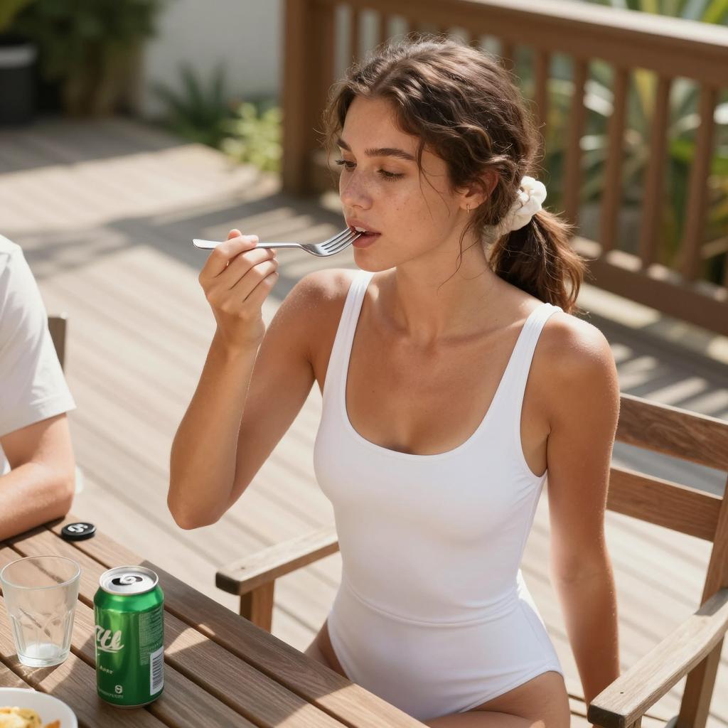 Young woman with tan skin and slim build in white one-piece swimsuit, brown ponytail tied with white scrunchie, eating from a fork, sitting at wooden outdoor table, green can and glass on table, another person partly visible on left. Sunlit wooden deck, greenery in background.