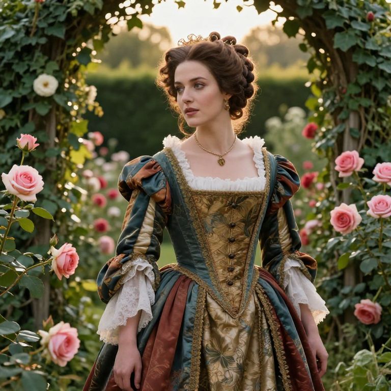 Desdemona, the noble and tragic Shakespearean character, portrayed in a lush garden filled with blooming roses and ivy, classical Renaissance attire with rich textures and vibrant colors, soft focused background with golden hour light, cinematic and romantic composition