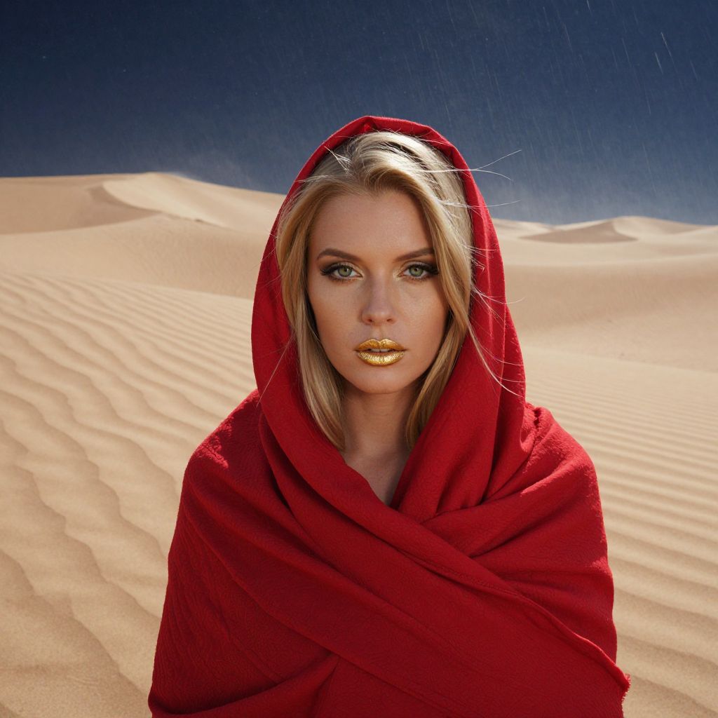 In this hyperrealistic portrait, a 25-year-old woman with striking blonde hair and captivating green eyes is the focal point. Her face is adorned with golden makeup and lipstick, adding a touch of elegance to her serene expression. She is wrapped in a vibrant red scarf that contrasts beautifully with the sandy dunes in the background, creating a sense of depth and movement. The scene is set in a desert during a heavy sandstorm, with the night sky painted in hues of dark blue and stars, adding a sense of tranquility amidst the chaos. The dunes, with their intricate textures and shapes, frame the woman, drawing the viewer's eye to her face. The overall composition is balanced, with the woman's face centrally positioned, and the sandstorm and dunes creating a dynamic interplay of light and shadow. The red dress fabric she wears adds a layer of complexity to the scene, with its rich texture and color complementing the natural elements around her.