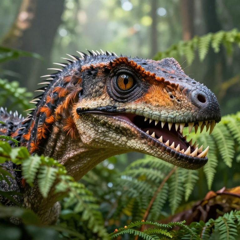 Close-up of a Pyroraptor's head emerging from dense ferns, sharp teeth visible, feathers ruffling with the humid mist, sunlight filtering through jungle canopy, detailed eyes filled with intelligence and primal ferocity, vibrant natural colors