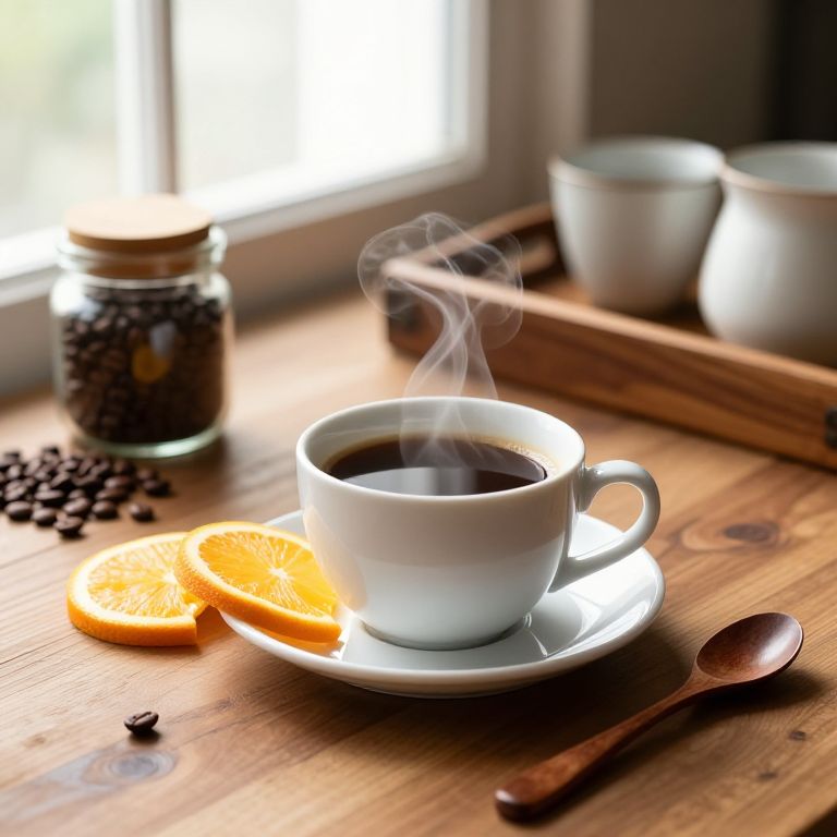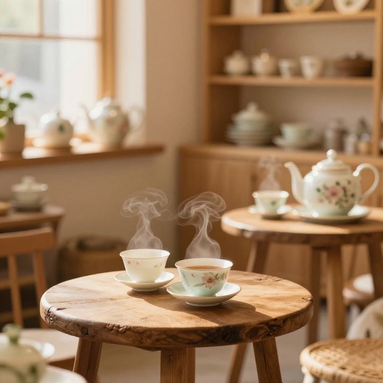 Photograph of a cozy, sunlit tea room with wooden furniture, floral teacups, and saucers steaming on a round wooden table