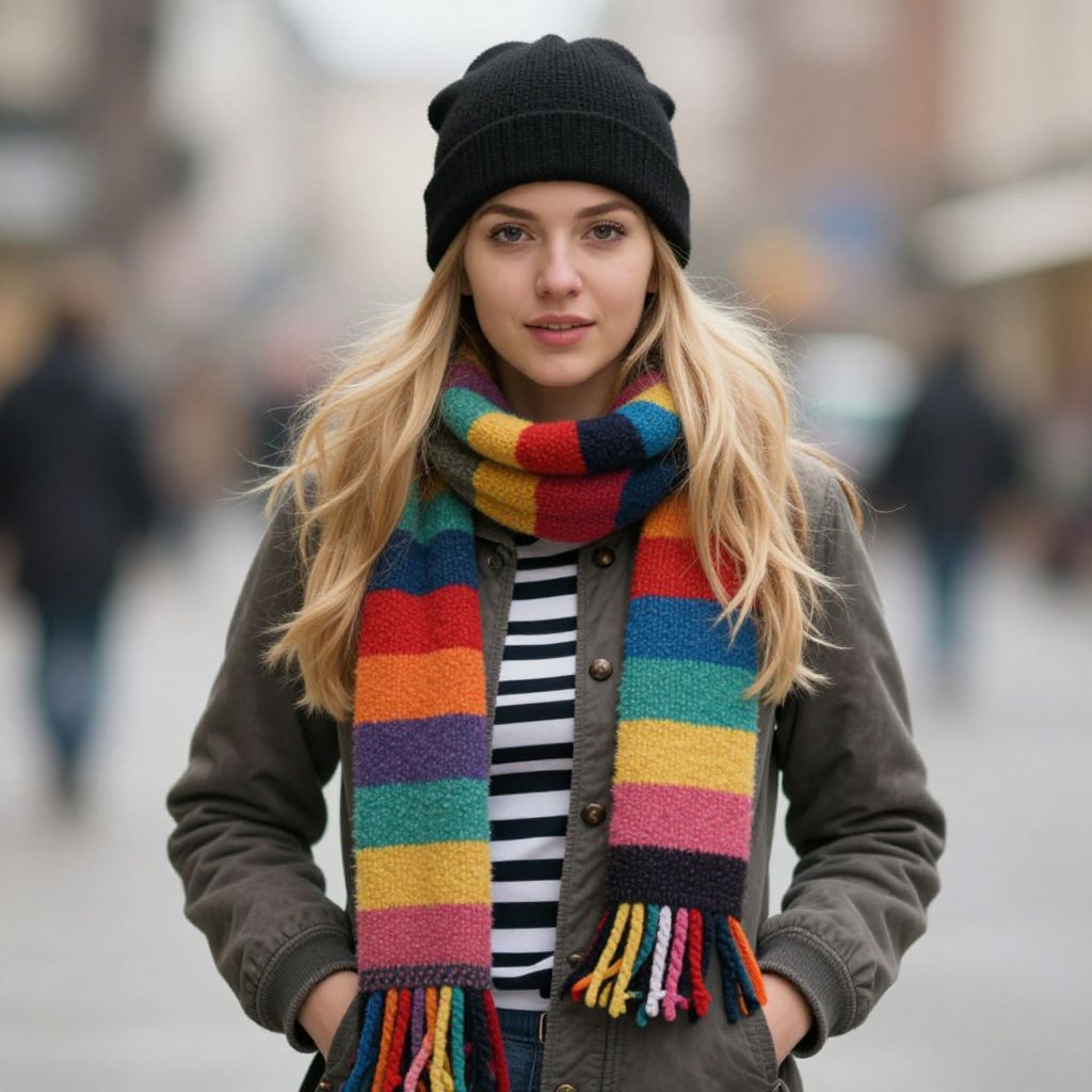 Photograph of a blonde woman with long hair, wearing a black beanie, multicolored striped scarf, and dark coat, standing in a blurred