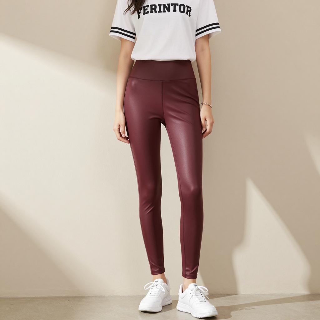 Young woman standing against a neutral beige wall wearing fitted burgundy leather-like leggings and a casual white short-sleeve t-shirt with black lettering and stripes on the sleeves. She is accessorized with a short bracelet and white sneakers. Sunlight casts a shadow on the wall behind her.