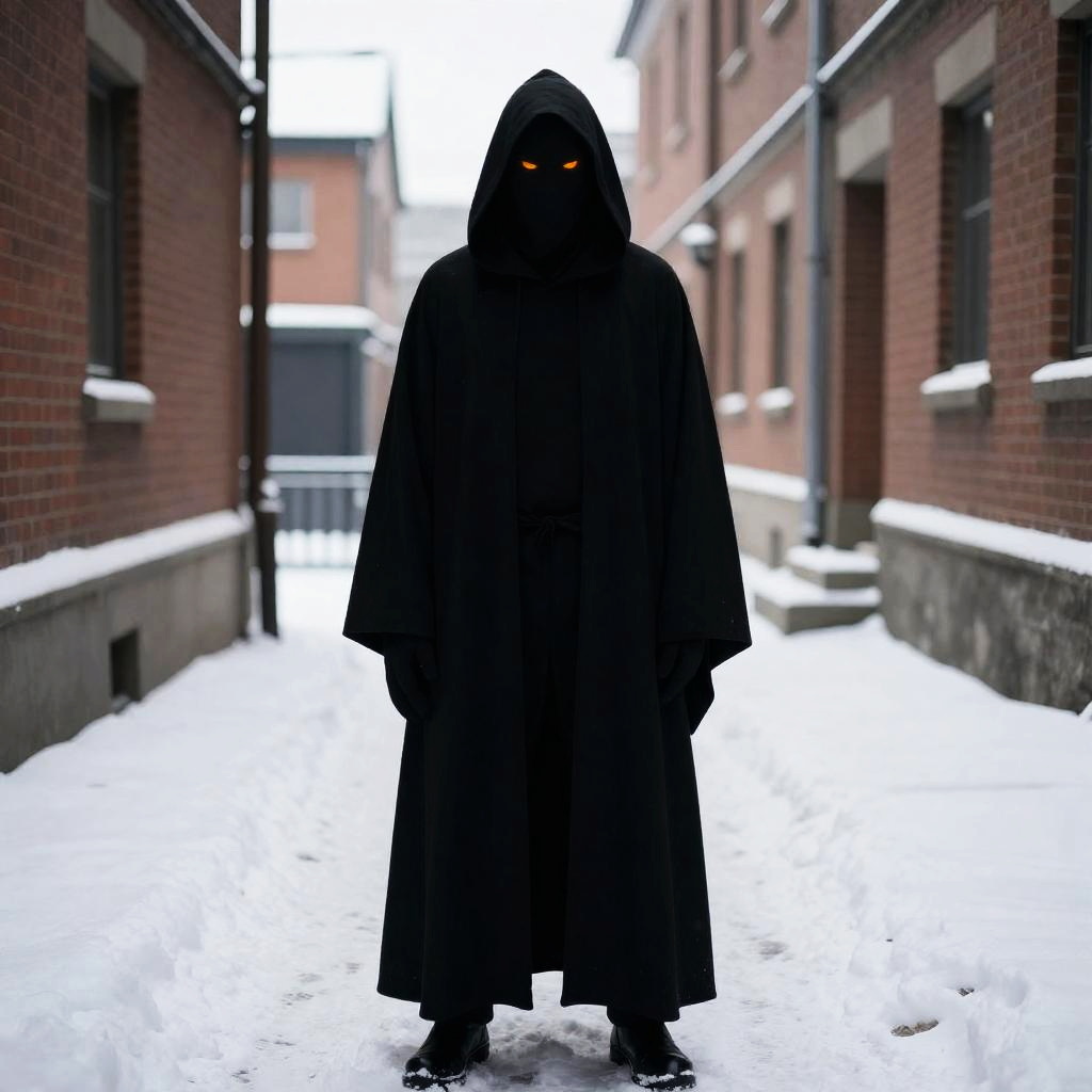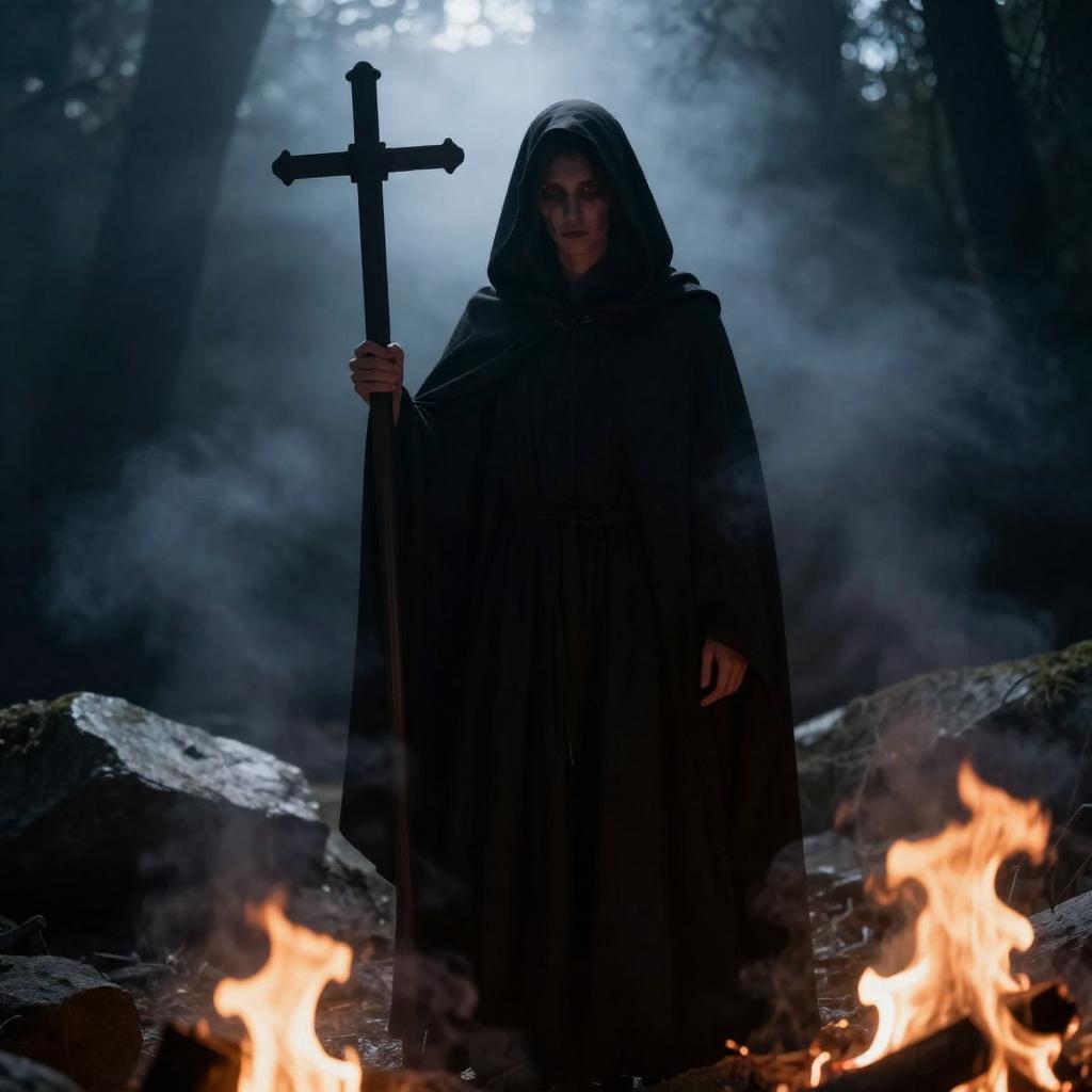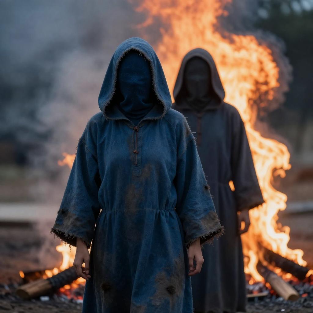 Photograph of two people in tattered, blue, hooded robes with their faces completely covered, standing in front of a large, bright orange fire. Smoky background with charred debris. One figure in foreground, other slightly behind. Intense, obscured facial expressions.