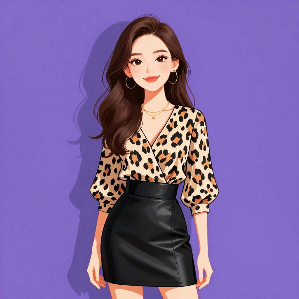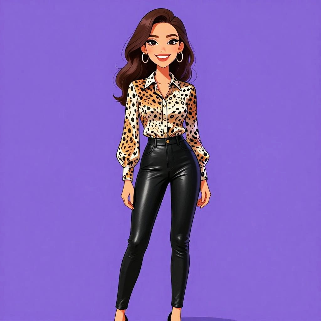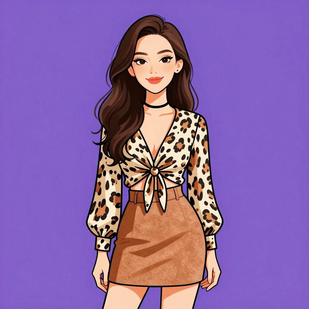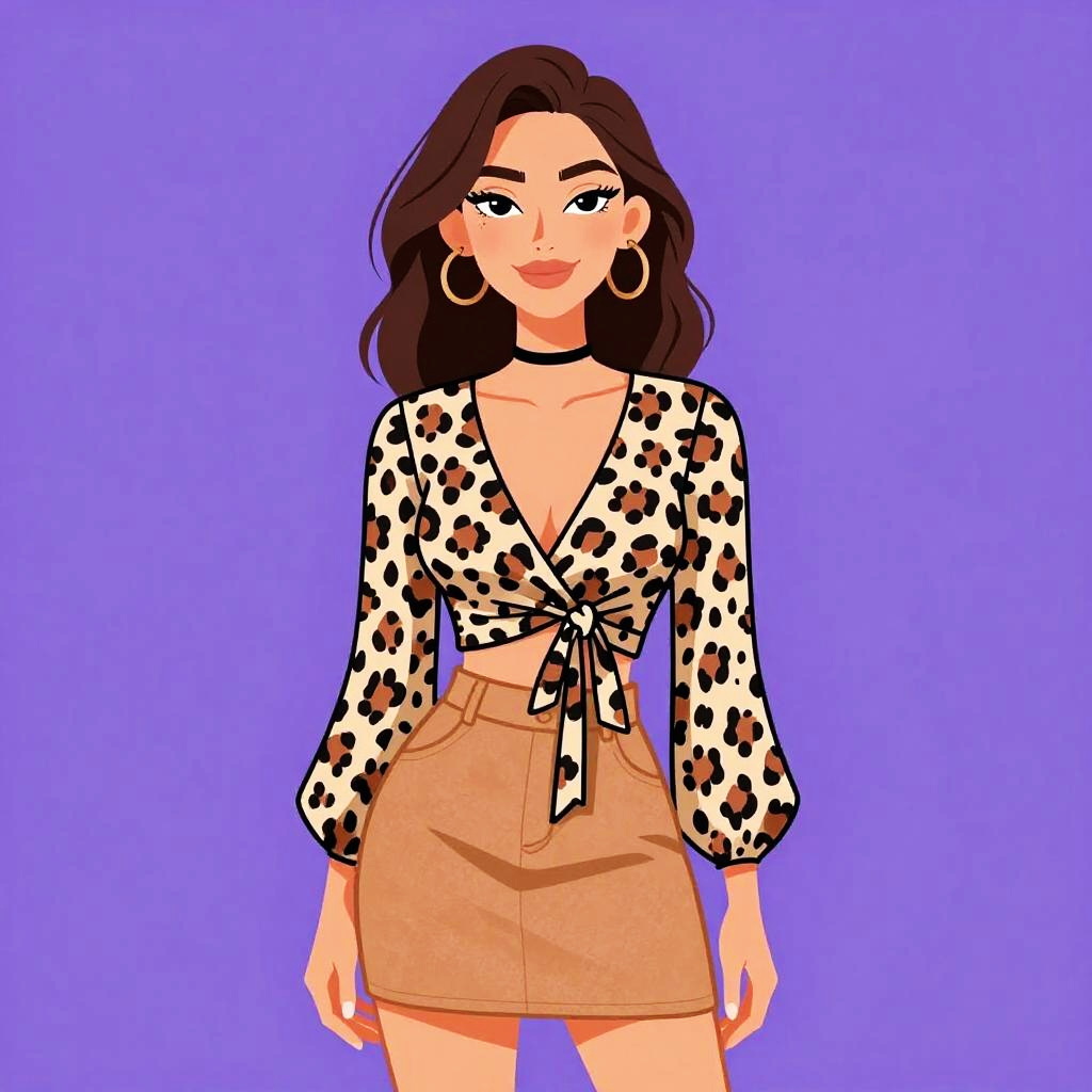 Woman with pretty face and pretty hair. smiling Woman, funky, animal print semi-sheer blouse with wide, drapey elbow-length sleeves, black lace-up detail at the deep V-neck, mixed patterns including leopard spots and zebra stripes in a black and tan color scheme; black textured mini skirt with an asymmetrical wrap design and ruching on the side. --sref 1467