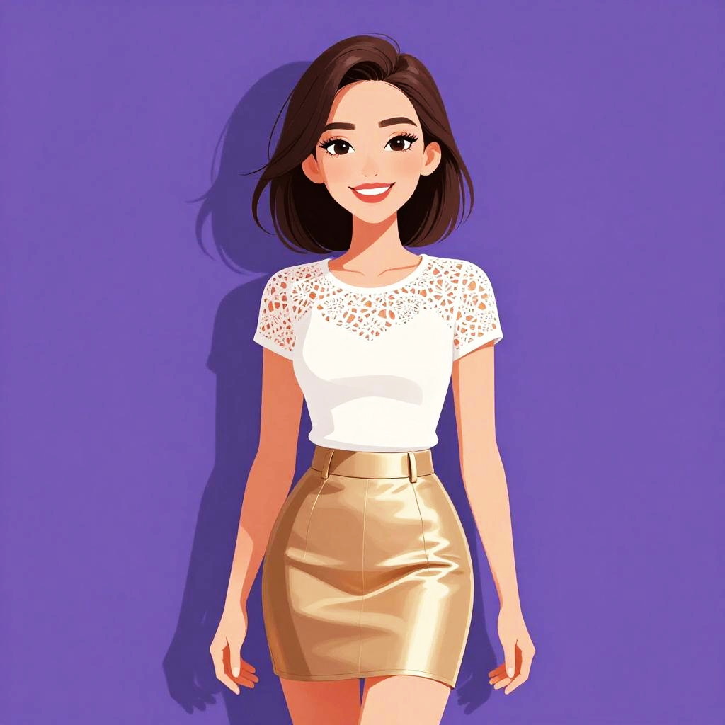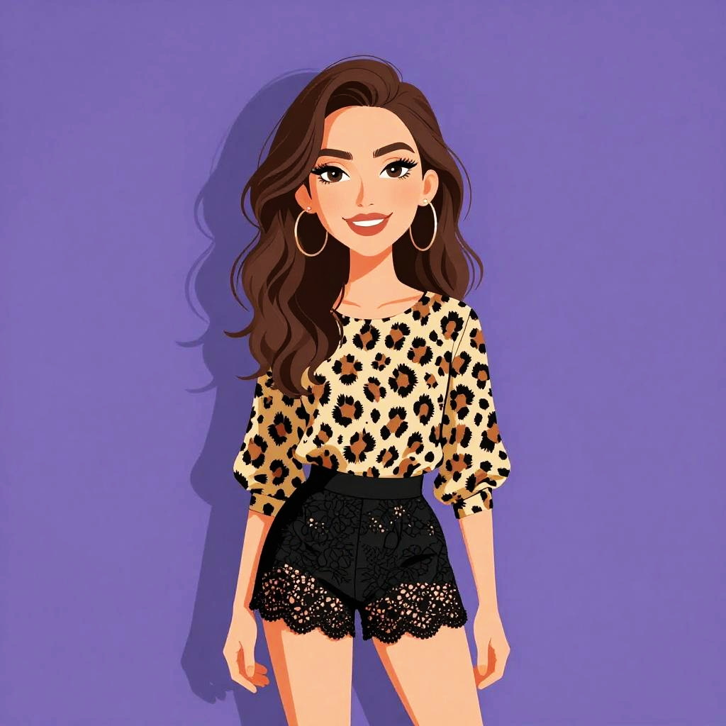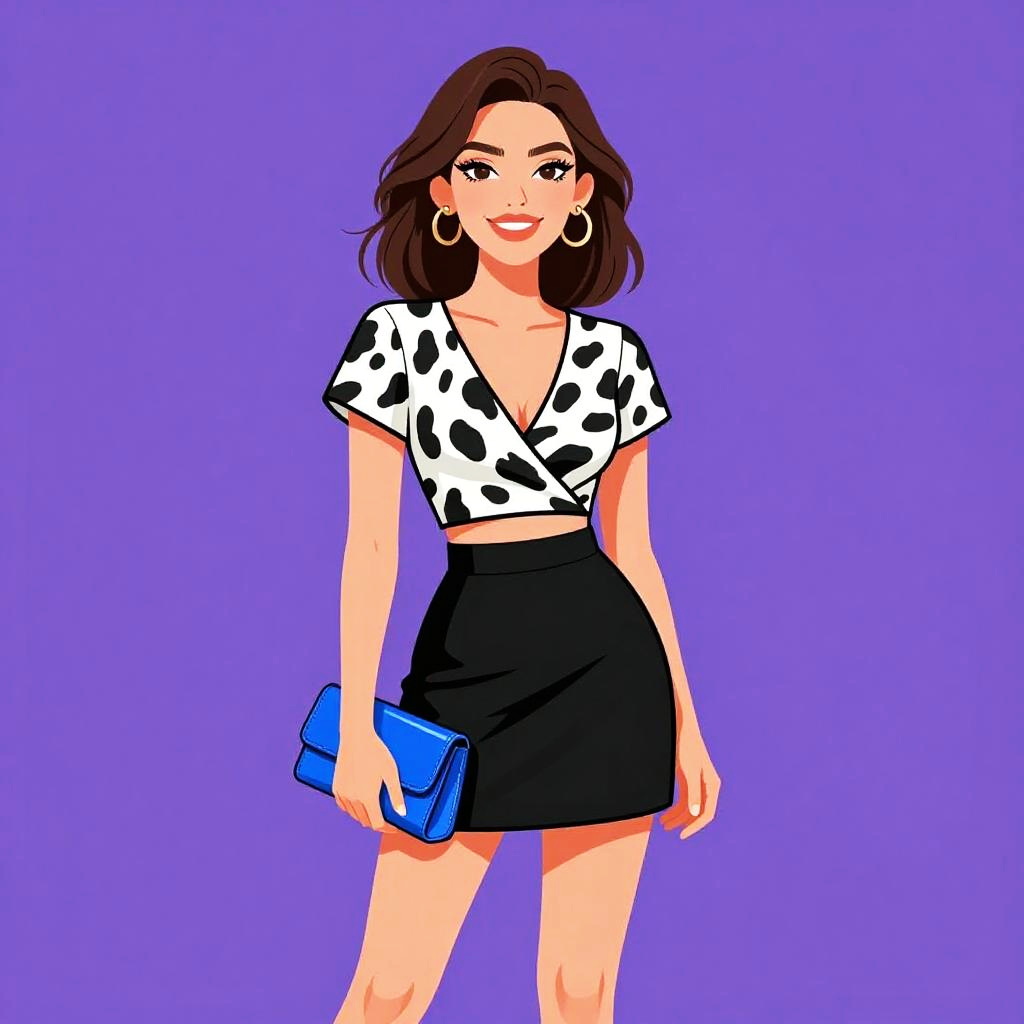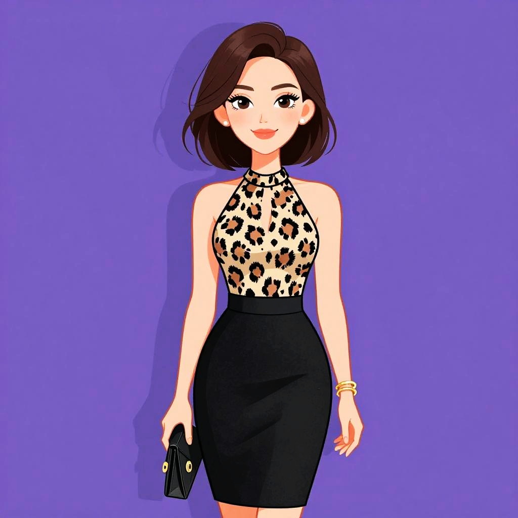 Woman with pretty face and pretty hair. smiling Woman, funky, animal print semi-sheer blouse with wide, drapey elbow-length sleeves, black lace-up detail at the deep V-neck, mixed patterns including leopard spots and zebra stripes in a black and tan color scheme; black textured mini skirt with an asymmetrical wrap design and ruching on the side. --sref 1467