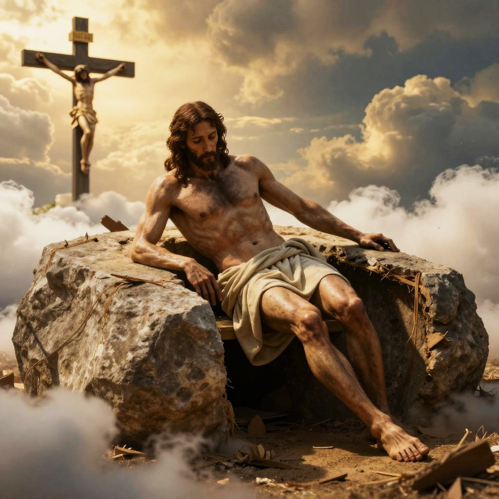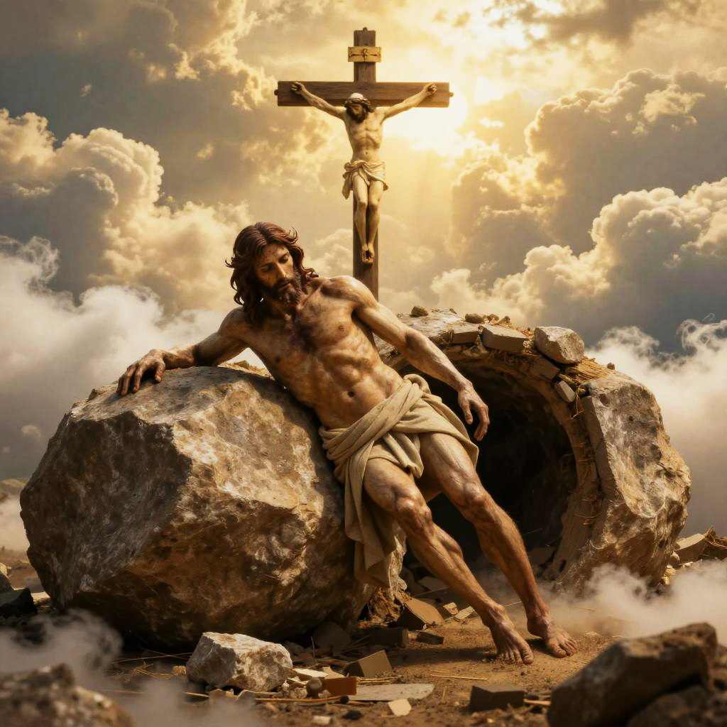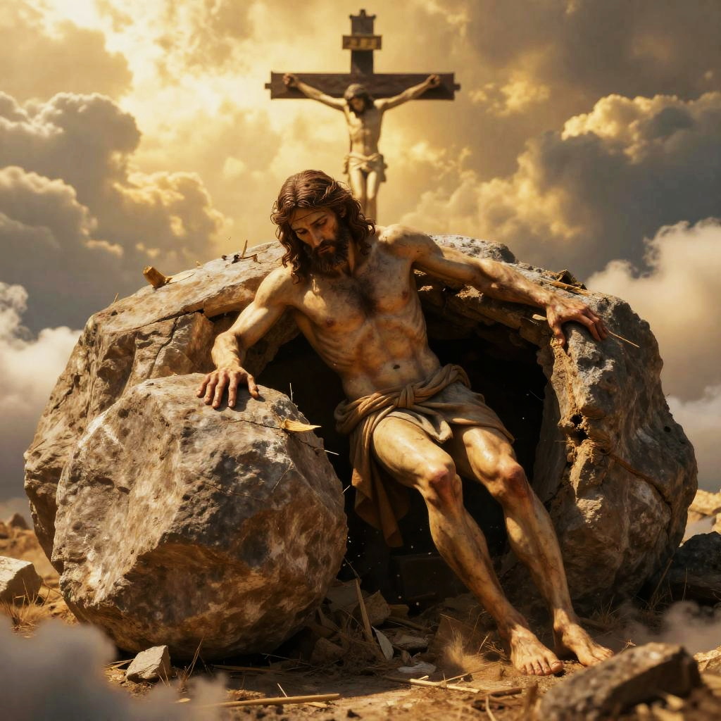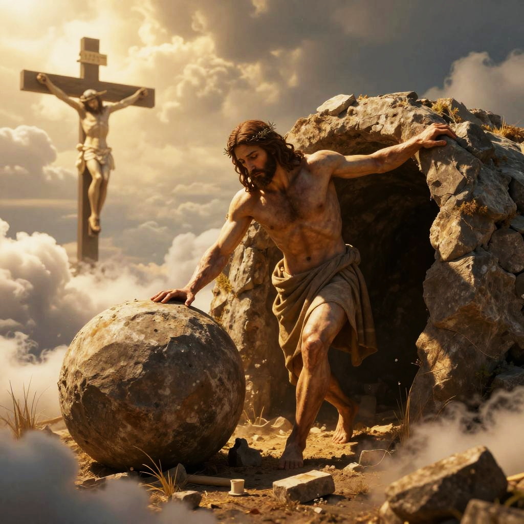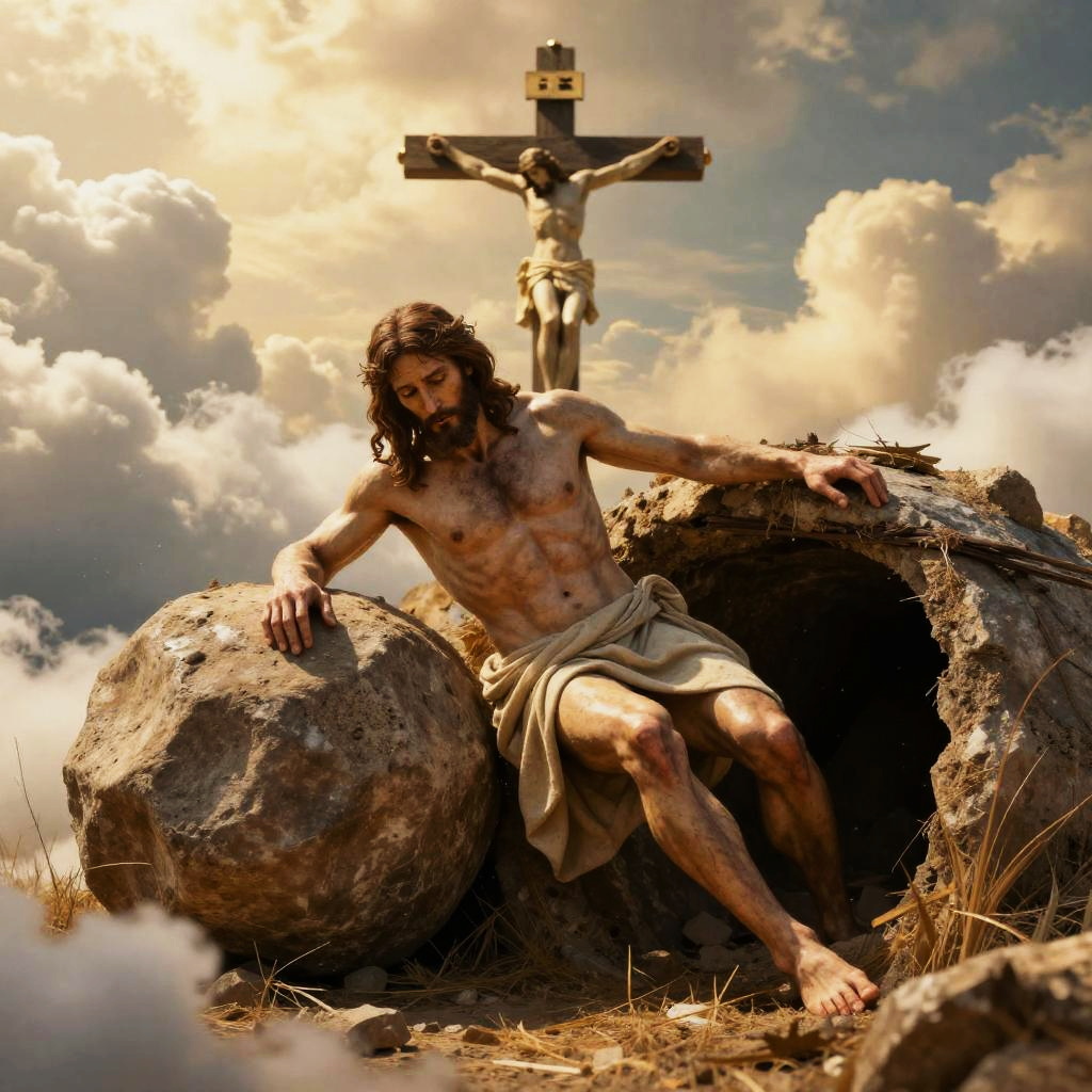 Photorealistic scene of resurrected Jesus leaving an empty tomb with a boulder rolled away, bathed in golden light. Cross of Calvary visible amidst clouds, cinematic lighting, sharp focus, ultra HD, 8K resolution, intricate details and realistic textures