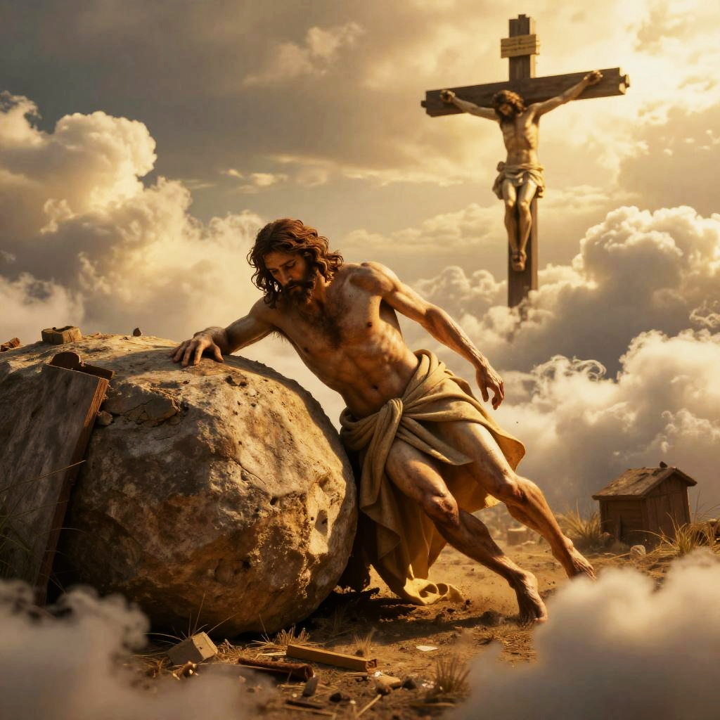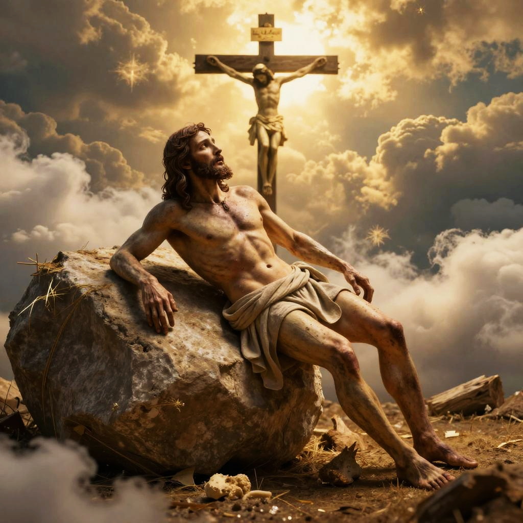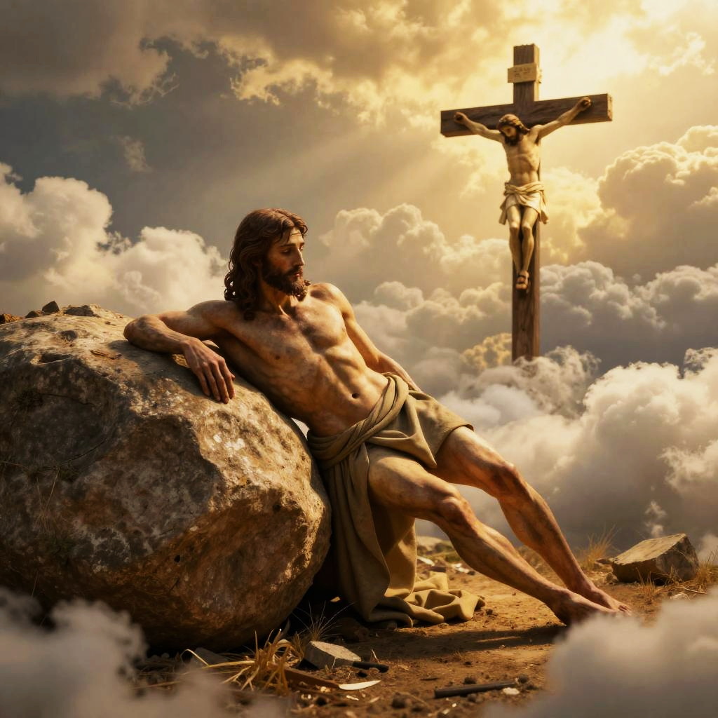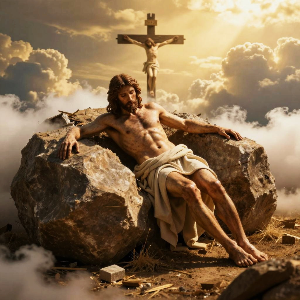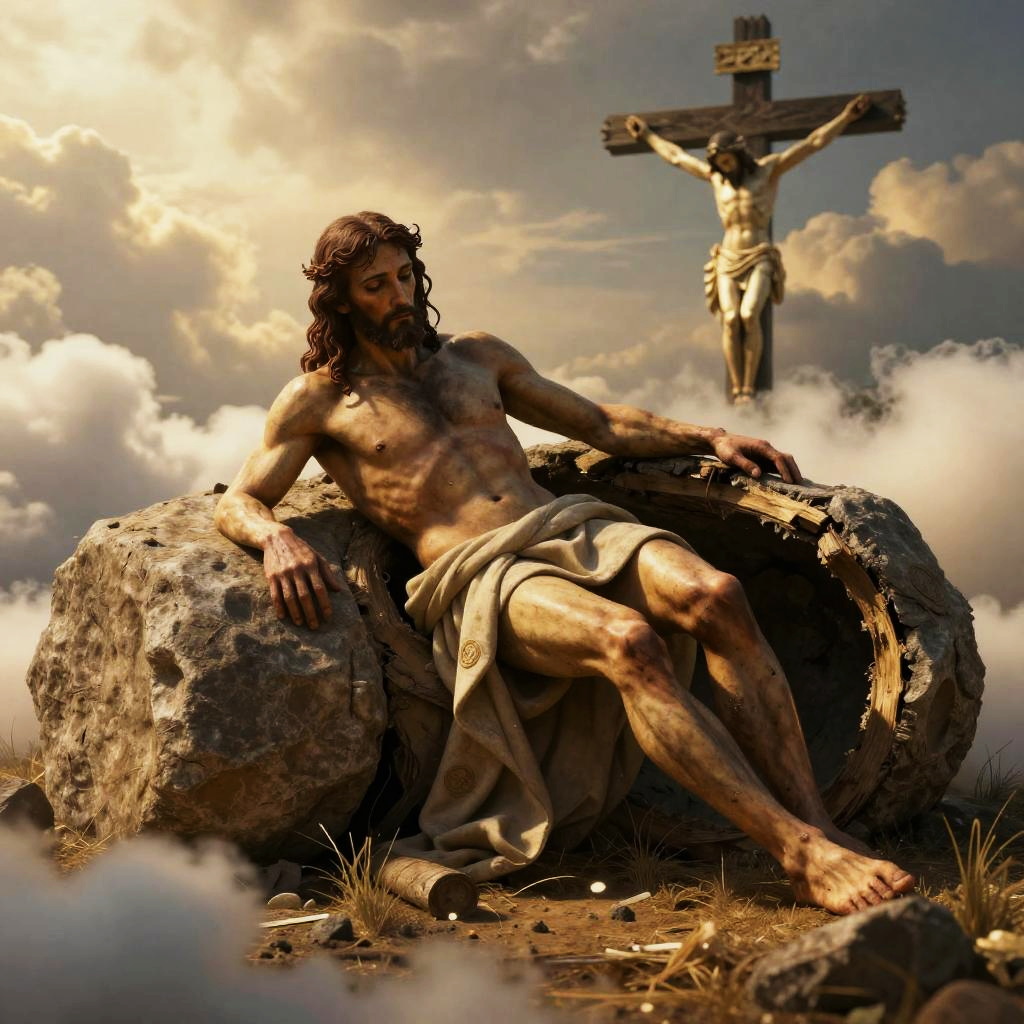 Photorealistic scene of resurrected Jesus leaving an empty tomb with a boulder rolled away, bathed in golden light. Cross of Calvary visible amidst clouds, cinematic lighting, sharp focus, ultra HD, 8K resolution, intricate details and realistic textures