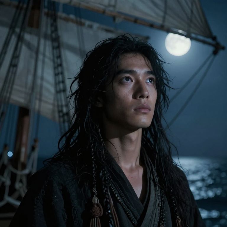 A captivating portrait of a mysterious seafarer, illuminated by soft moonlight filtering through tattered sails, showcases their rugged features in a traditional yet enigmatic style. The unconventional angle, slightly above and behind the subject, reveals not only their pensive expression but also the vast night sky reflected in their eyes. This hyperrealistic image, with its dreamlike quality, evokes an atmosphere of tranquility and introspection, hinting at untold tales of voyages across uncharted waters.