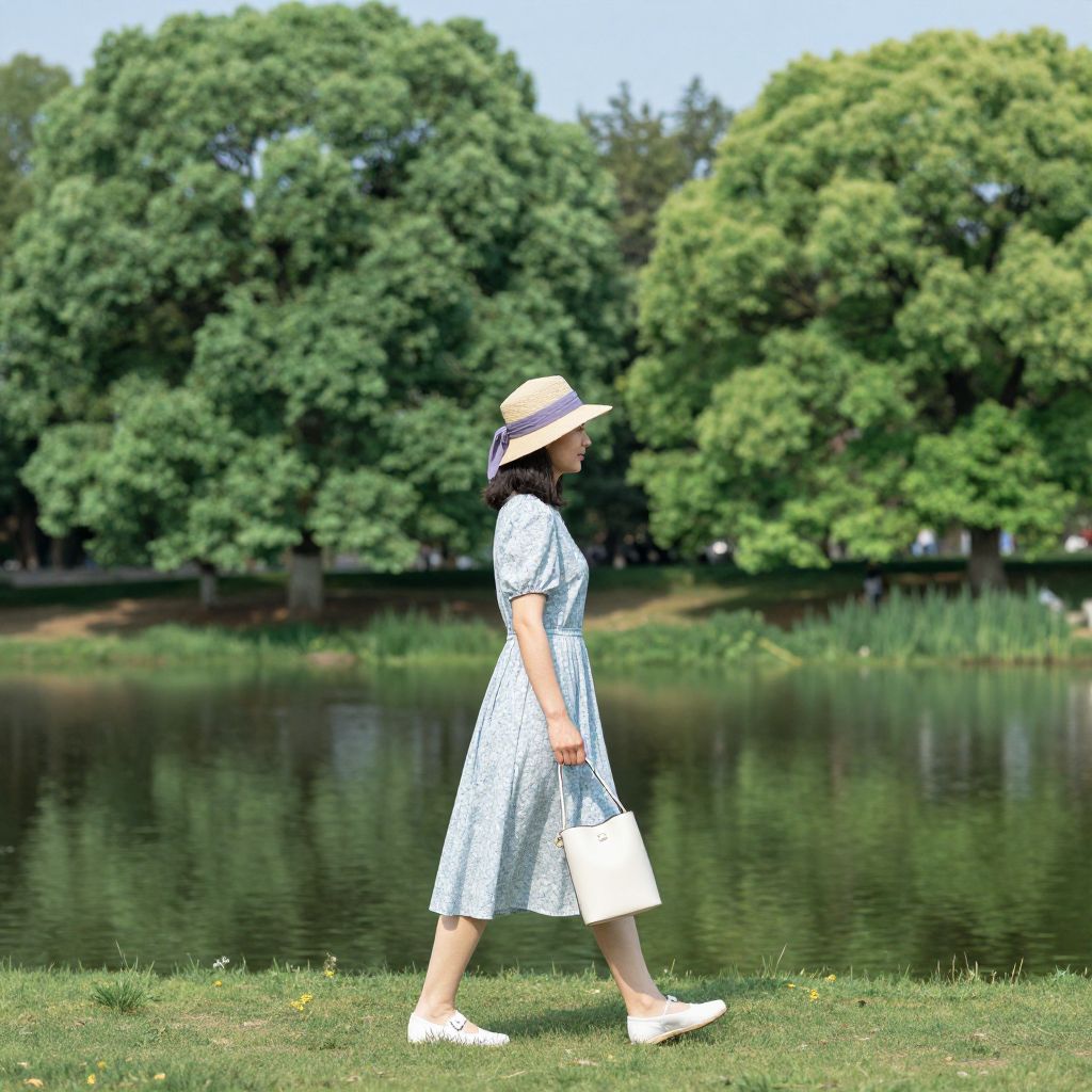 Photograph of an Asian woman in profile, walking beside a tranquil pond. She wears a light blue, short-sleeved, knee-length dress with a subtle floral pattern, white flat sandals, and a beige sun hat with a white ribbon. She holds a white handbag in her right hand. The background features lush, green trees with dense foliage, and the calm water of the pond reflects the greenery. The grassy bank she walks on is dotted with small patches of white flowers. The scene is bright with natural sunlight, creating sharp shadows and highlighting the serene, summery atmosphere.