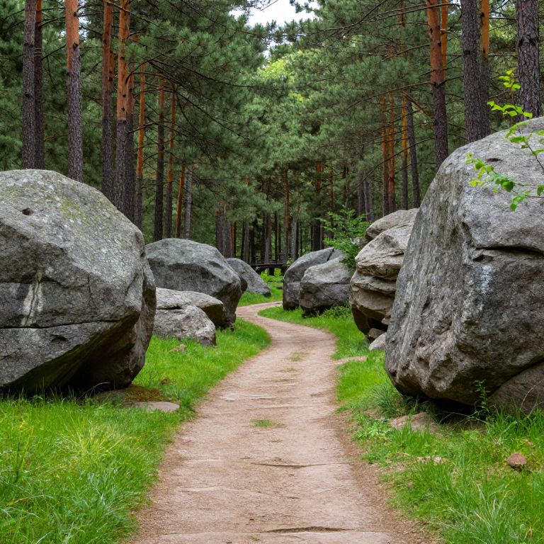 Path winds through a serene glade in a towering pine forest, flanked by large gray boulders and vibrant green grass, with sunlight filtering through the dense canopy above.