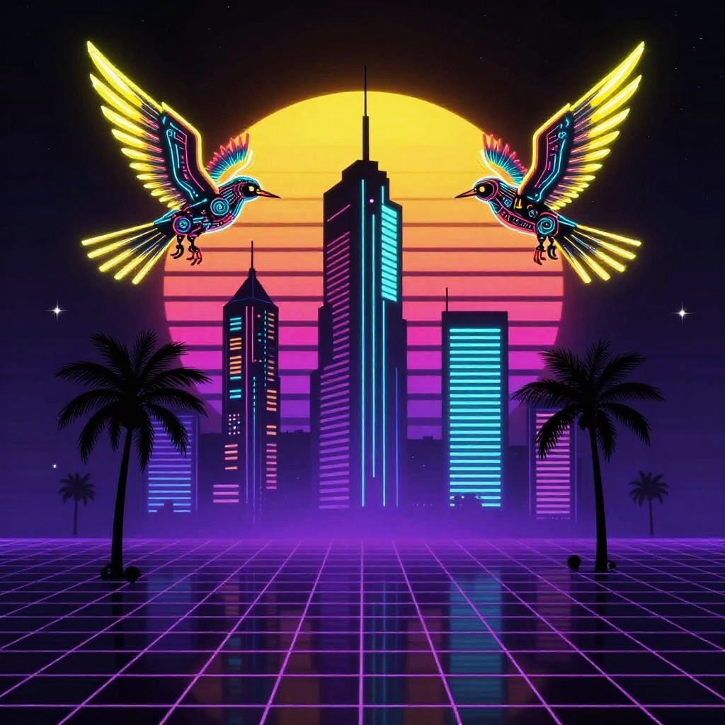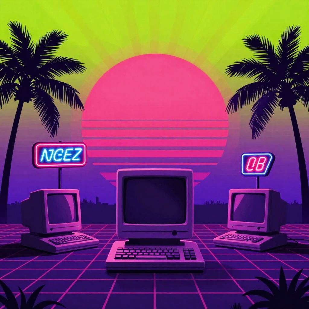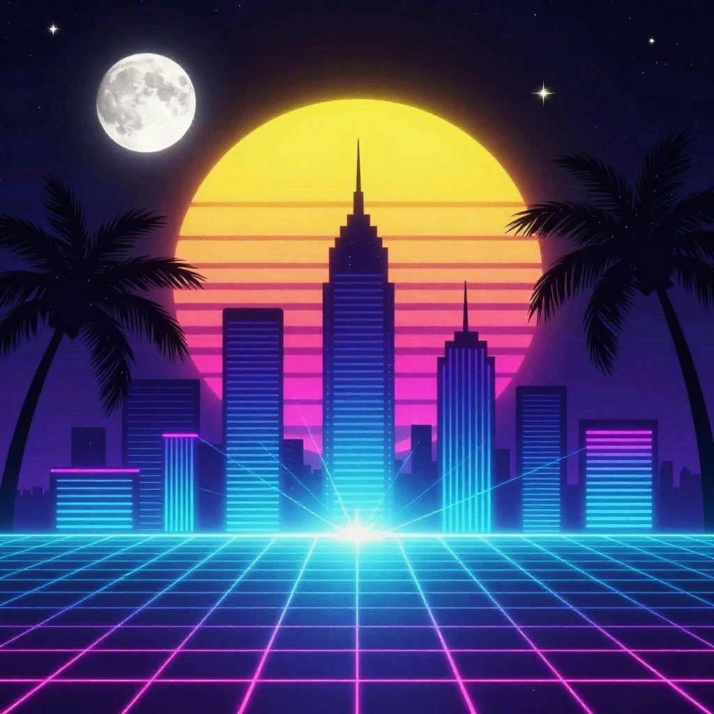 Create a retro 80s synthwave design featuring futuristic bikes, glowing geometric shapes, and a sun with lens flare, use bright colors like electric pink, lime green, and bright indigo, include elements like a grid pattern on the ground, silhouetted palm trees, and a large setting sun with glowing rays