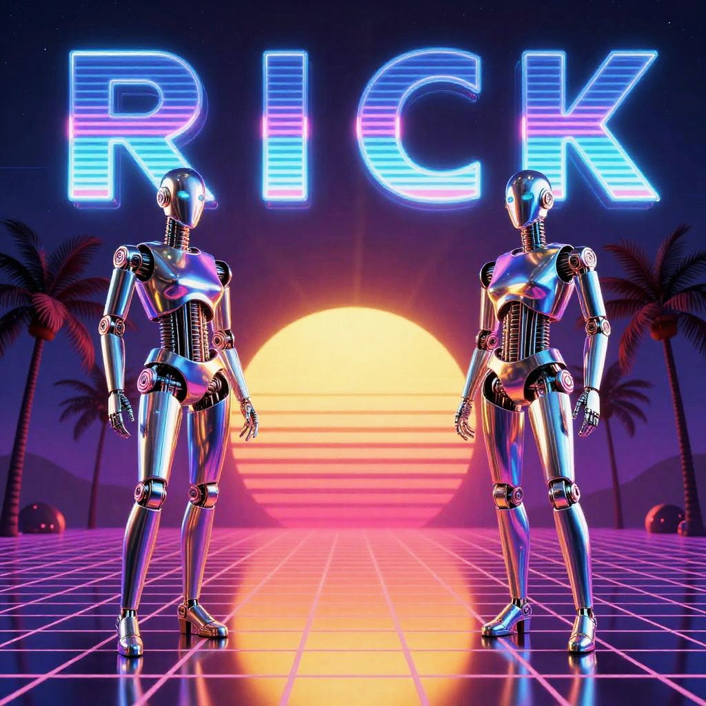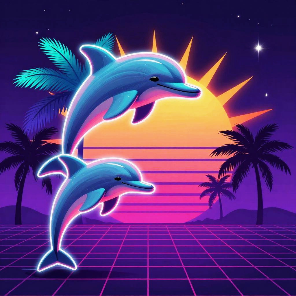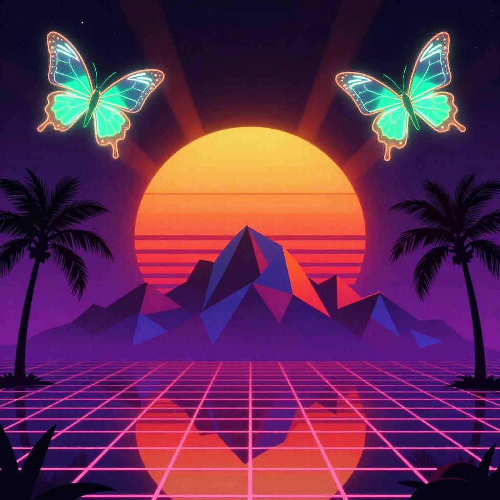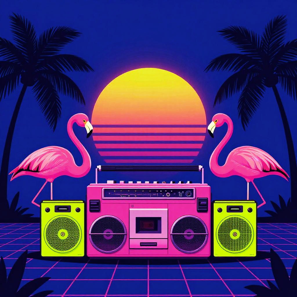 Create a retro 80s synthwave design featuring futuristic bikes, glowing geometric shapes, and a sun with lens flare, use bright colors like electric pink, lime green, and bright indigo, include elements like a grid pattern on the ground, silhouetted palm trees, and a large setting sun with glowing rays