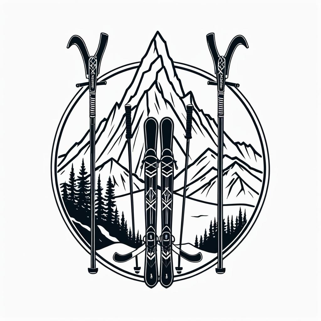 Plain Old school tattoo also called American traditional or Western traditional, style featuring thick bold black outlines simple design and a limited color palette, with common motifs influenced by sailor tattoos. skiing, mountain, peak, ski poles crossed . create on a solid white background.,