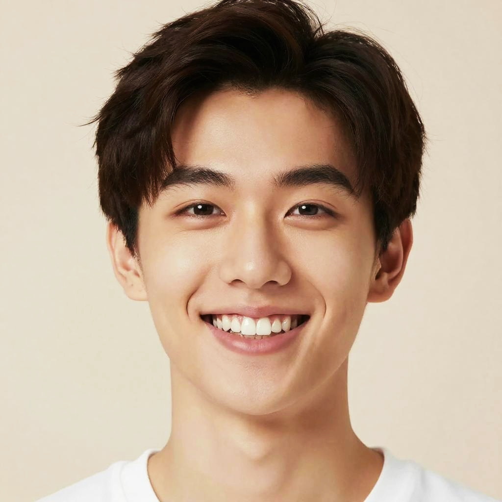 Portrait of a young adult with a radiant smile, teeth free of braces, bright eyes full of confidence, warm natural light enhancing smooth complexion, minimalistic background with soft pastel hues, photorealistic detail