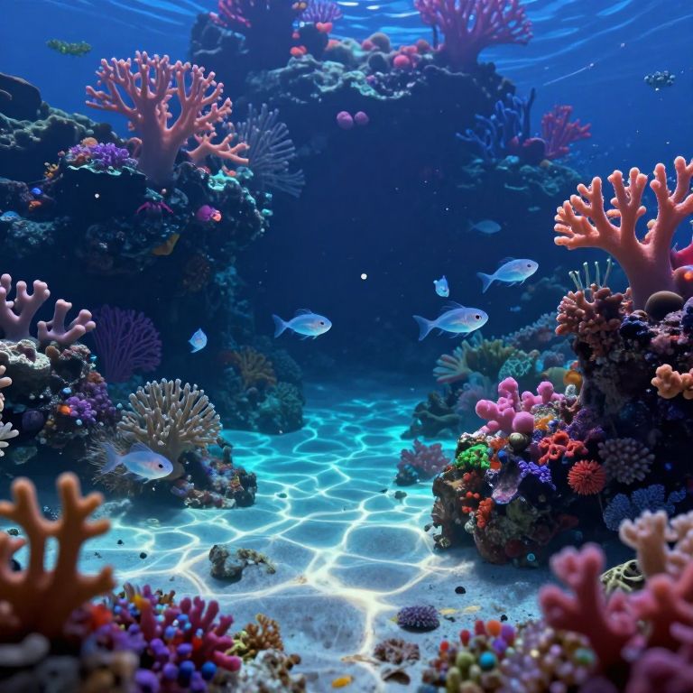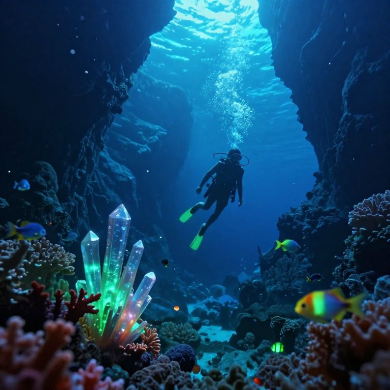 Hot promts: A dreamy undersea cave with bioluminescent fish, coral formations, and floating crystal structures, soft blue and green lighting, an exploratory figure diving through glowing waters with a sense of wonder.