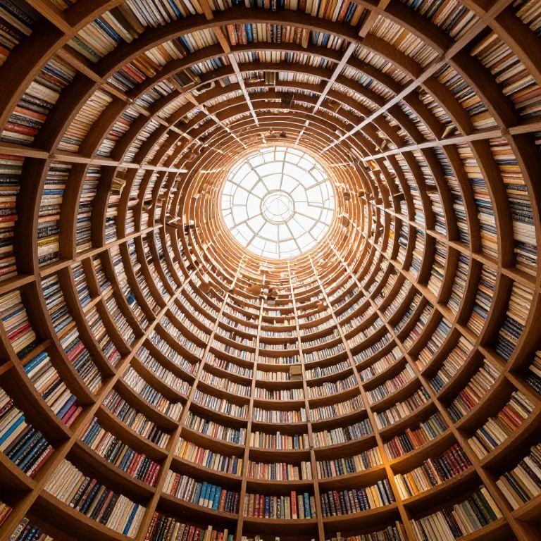 An endless, doughnut-shaped library spirals infinitely upward, its wooden shelves lined with books that cascade like sand, defying gravity in a mesmerizing, surreal dance of knowledge.