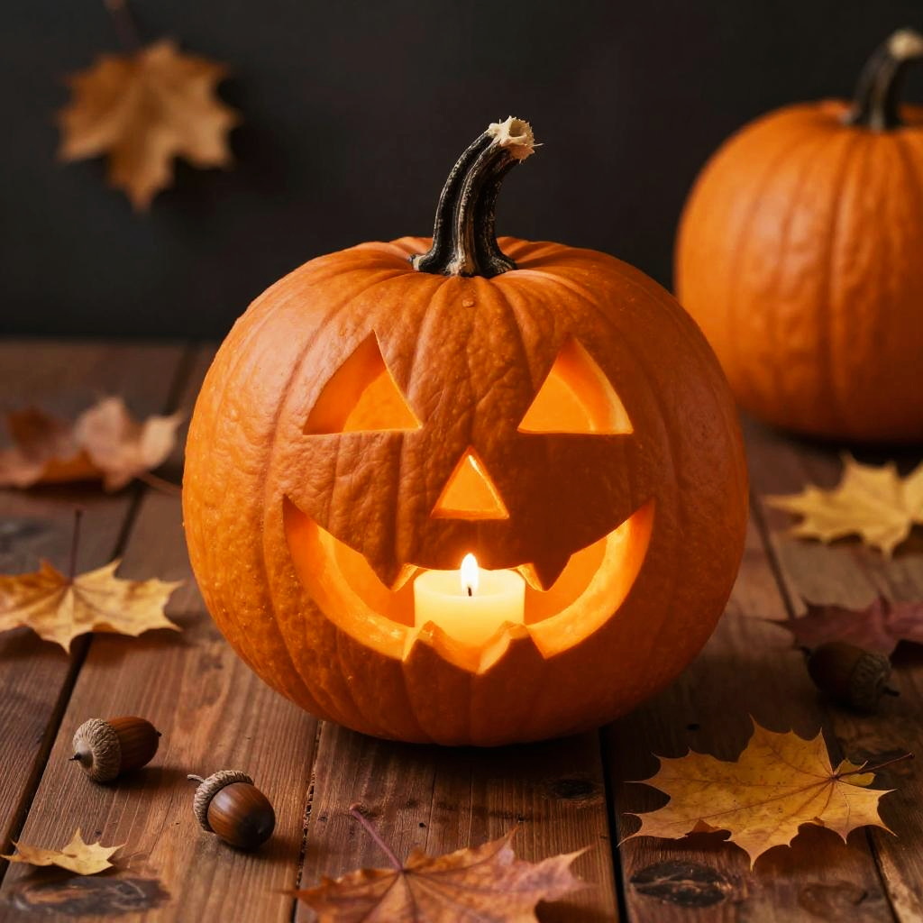 Jack o'lantern pose on rustic wooden table, flickering candle light inside, surrounded by fallen pumpkin leaves and scattered autumn acorns, cozy warm colors
