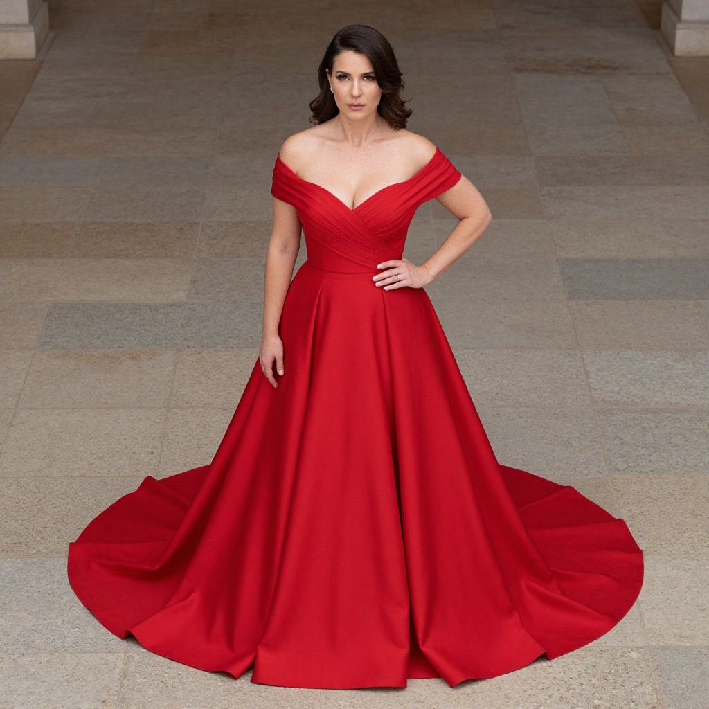 Photograph of a fair-skinned woman with dark curly hair, wearing an off-the-shoulder, red, floor-length gown with a wide skirt