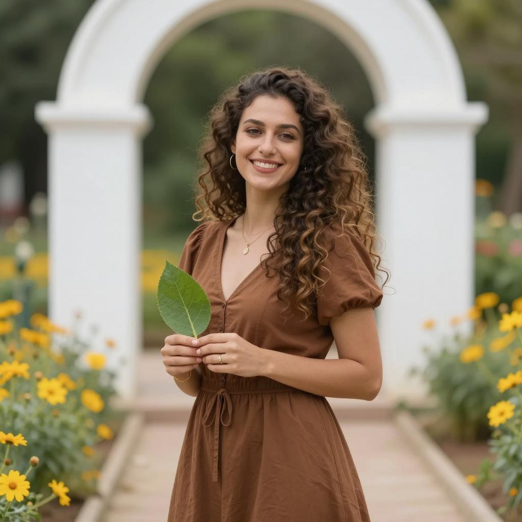Woman with long curly brown hair, wearing a brown dress, smiling, holding a green leaf, standing in a garden with yellow flowers, tall white archway, and greenery in the background. Sunny, outdoor setting.