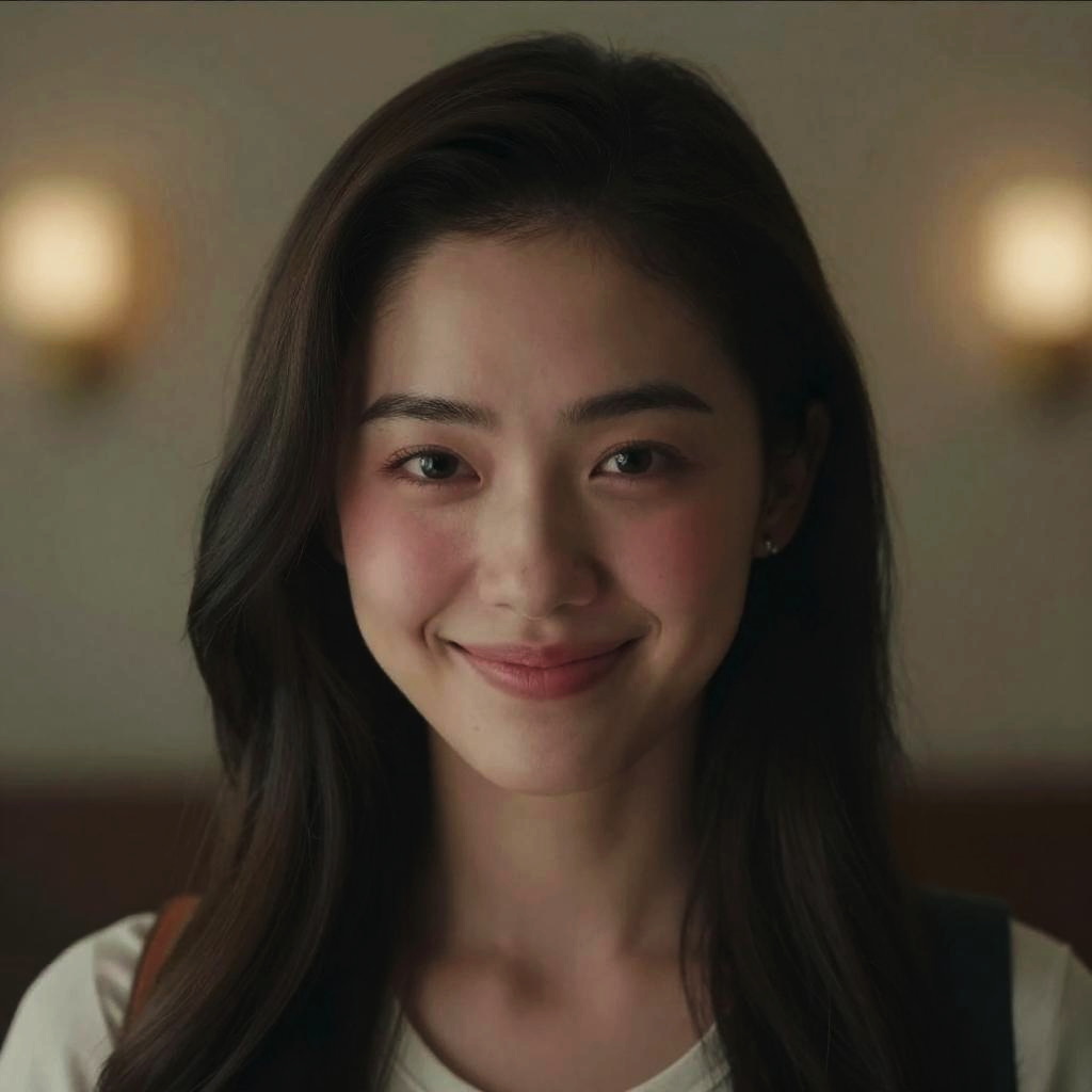 Photograph of a smiling young Asian woman with long black hair, fair skin, wearing a white shirt, against a softly lit background with two wall s