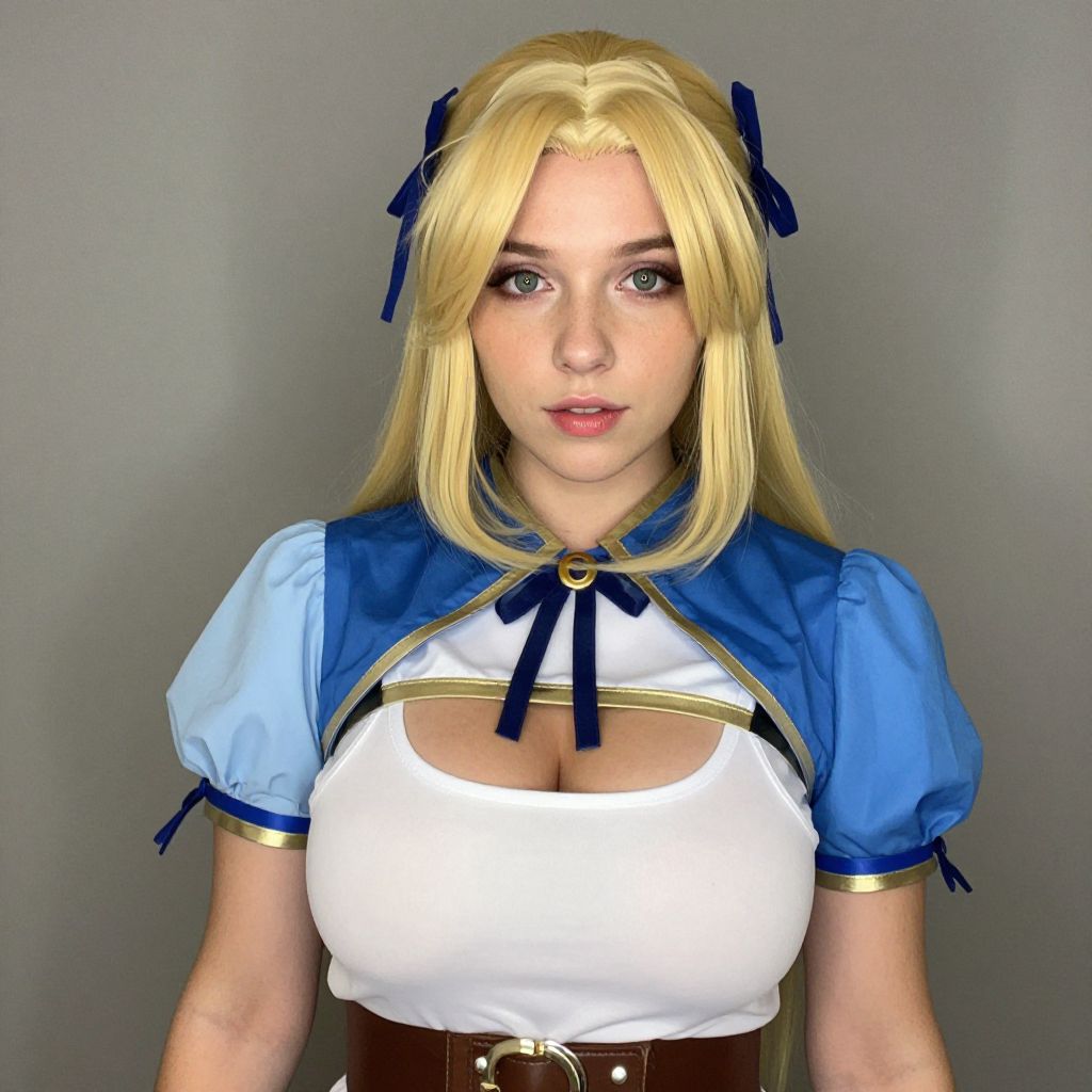 Sexy cosplay woman character wearing Lynn Minmay costume. Realistic photo. Jane Doe dressed as Lynn Minmay. Realistic photo, caucasian woman, pretty cute face, very big breasts
