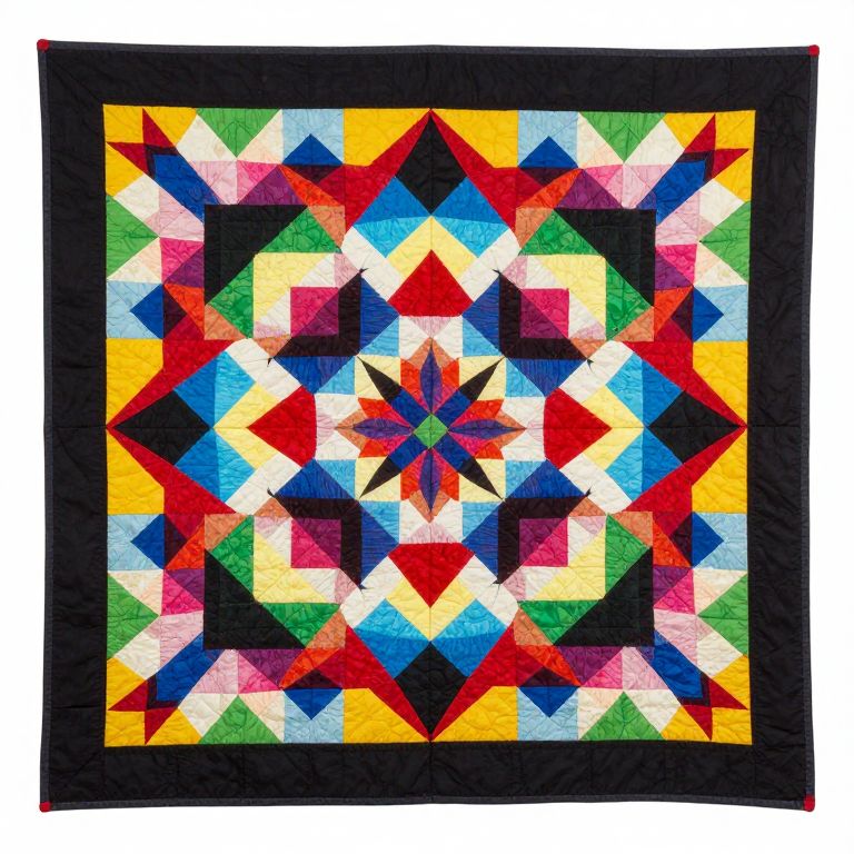A vibrant and intricately designed quilt by Bari J. of Live Art Gallery Fabrics, showcasing the Virtuosa Collection, features a bold geometric pattern with a central starburst motif surrounded by colorful, repeating diamond shapes and contrasting black borders, exemplifying a high-definition, modern textile art style.