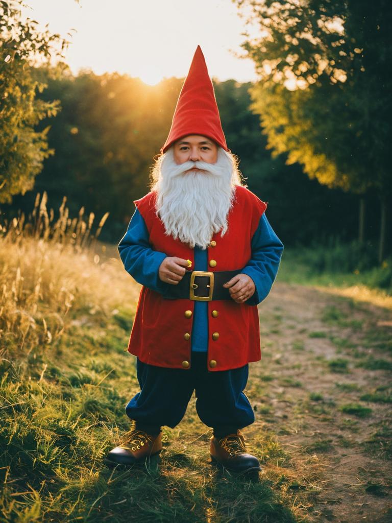 Portrait of a man dressed in a traditional gnome costume featuring a red pointed hat, white beard, red and blue coat with yellow trim, black belt, blue pants, and brown boots, standing on a garden path during golden hour with greenery in the background.