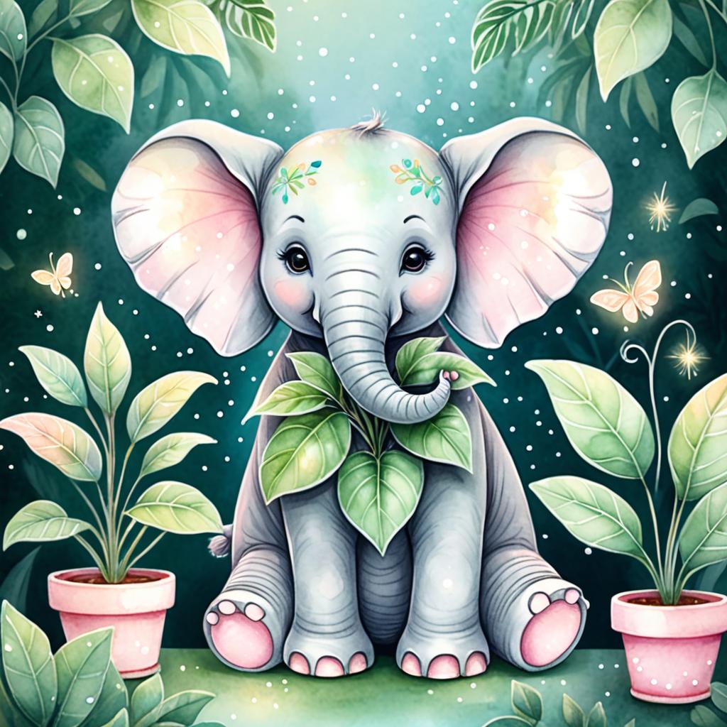 A cute cartoon baby elephant watering a potted plant, surrounded by lush green leafy plants in soft pastel colors, watercolor texture with whimsical style, glowing fireflies and sparkles around, gentle warm color palette including pink, blue, and green hues, set in a magical garden atmosphere