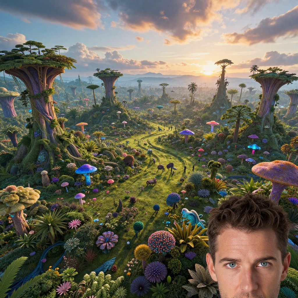 [[man,biome picture]]Sweeping aerial view, capturing the vast expanse of a thriving, otherworldly biome, teeming with life. Towering trees, iridescent flowers, glowing mushrooms, exotic creatures roam freely beneath a kaleidoscope sky. Rich greens, blues, and yellows dance across the landscape, as sunlight filters through dense foliage, illuminating Man has masculine face and piercing eyes