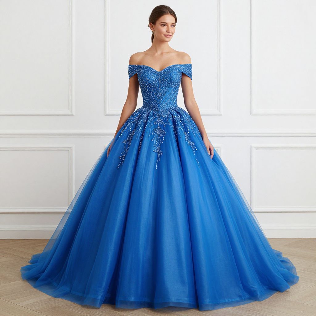 Elegant woman showcasing a vibrant blue ball gown featuring off-the-shoulder detailing, intricate beadwork, and a flowing tulle skirt against a classic white panel backdrop.
