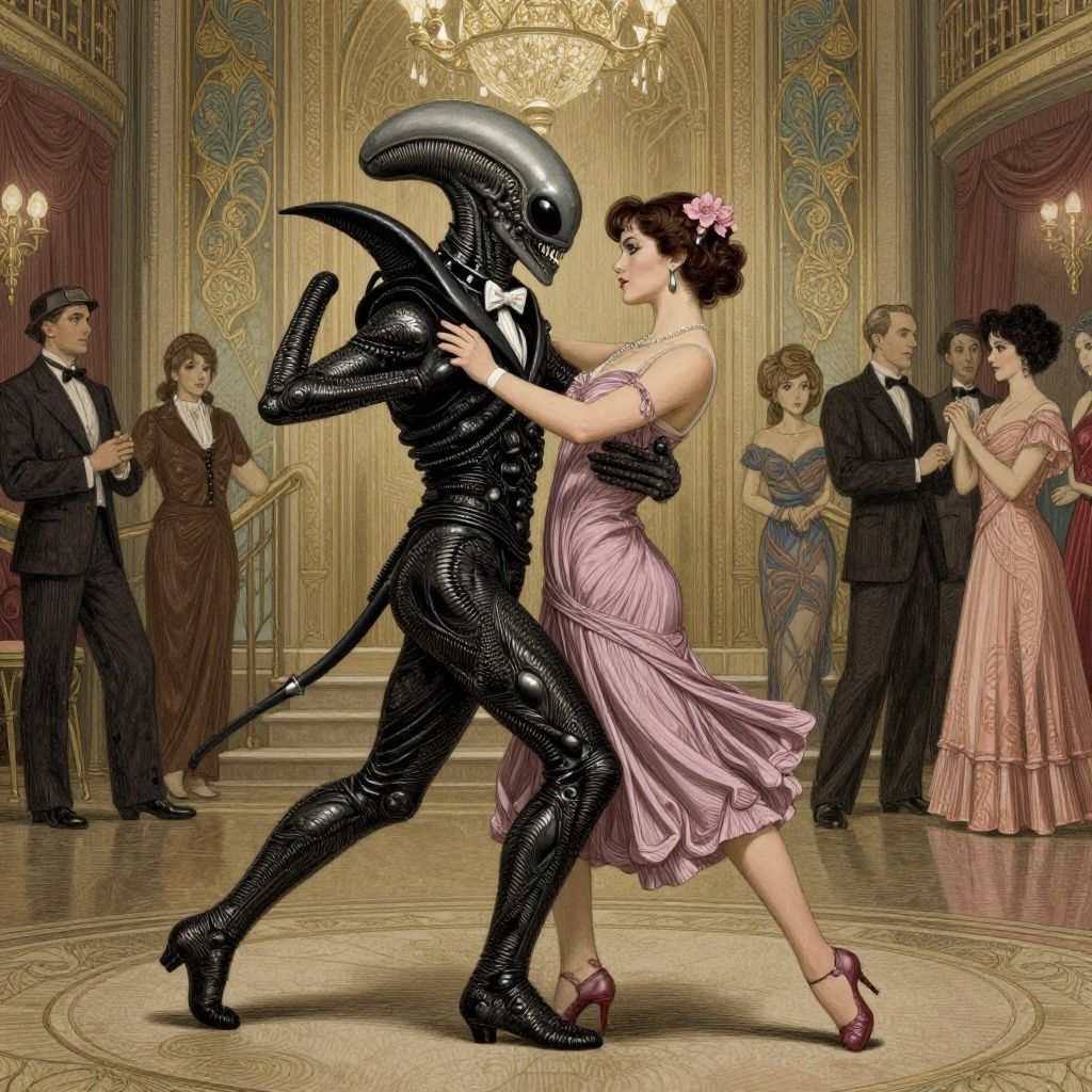 1alien, 1girl, an alien (xenomorph from ALIEN:1.4) wearing wing collar, bow tie, and tails, dancing tango with a beautiful woman on his arm, (at the ball:1.3)paris belle epoque france, 1920detailed, cinematic, (etching in the style of charles dana gibson with anime influence) (cinematic still from ALIEN) (sophisticated and decadent) (art deco flair)