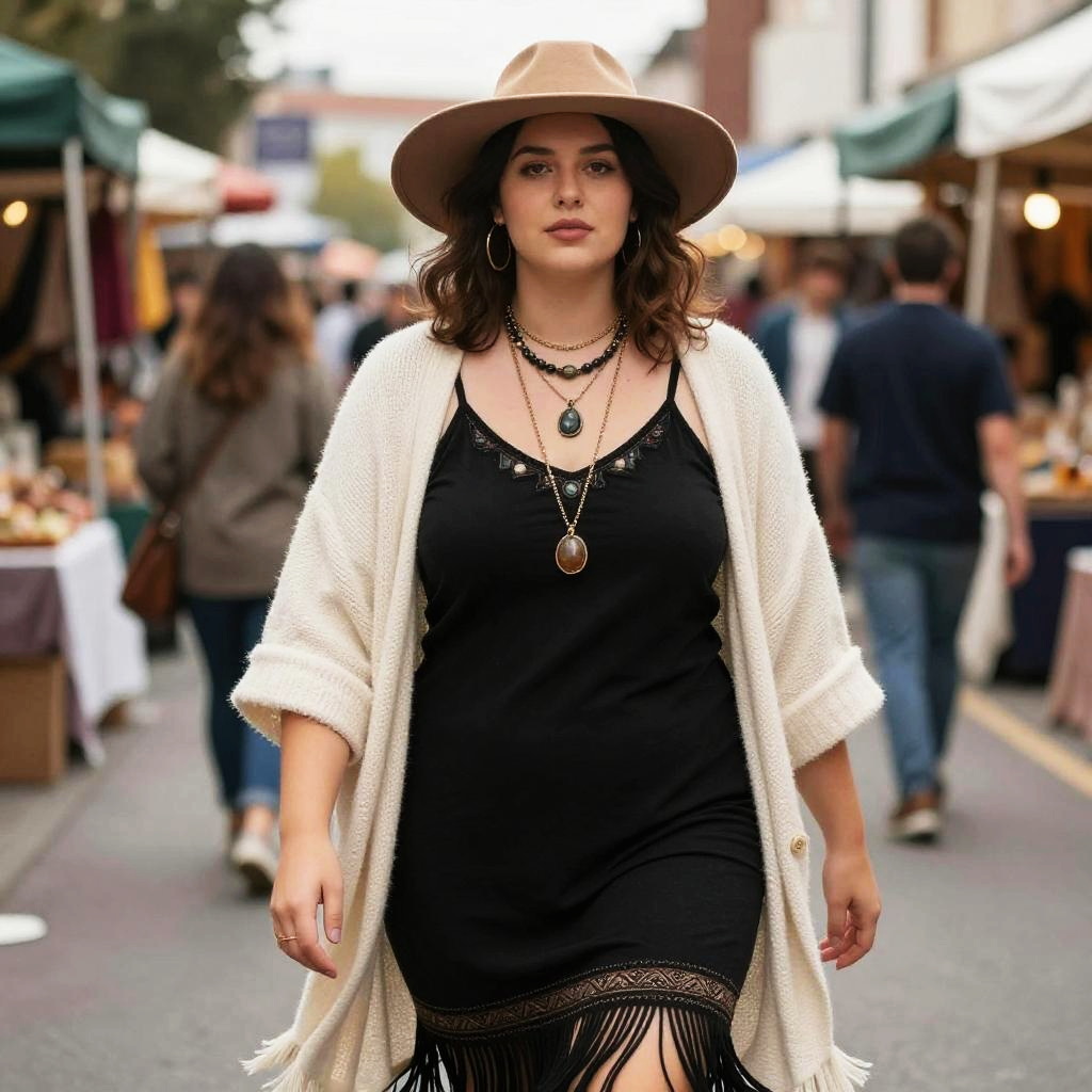A lanky woman in a bohemian black slip dress with fringed hem and an oversized off-white cardigan, layered necklaces, and a wide-brimmed floppy hat, stands at a bustling cultural street fair, captured in a madhouse visual style. Sexy. Pretty face and beutiful eyes