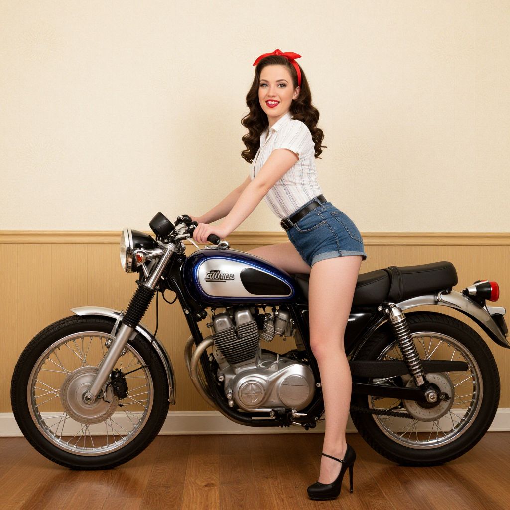 Photograph of a retro-styled woman with red bow, white blouse, denim shorts, and black heels, sitting on a Suzuki motorcycle.