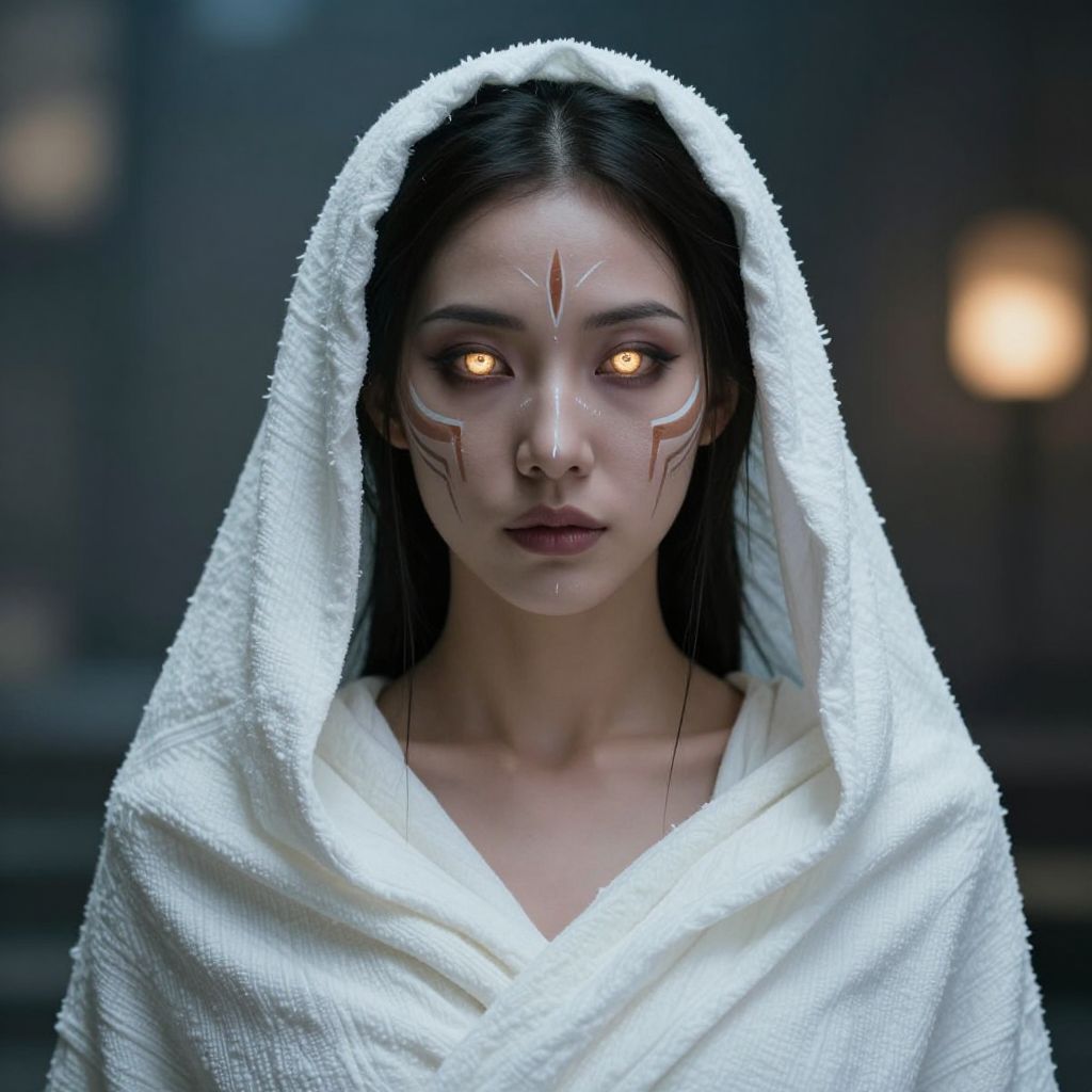 A film still of a synthetic female human oracle wrapped in white cloth, beautiful, tribal facepaint, glowing eyes, neotokyo, cinematic lighting, high resolution, 4 k