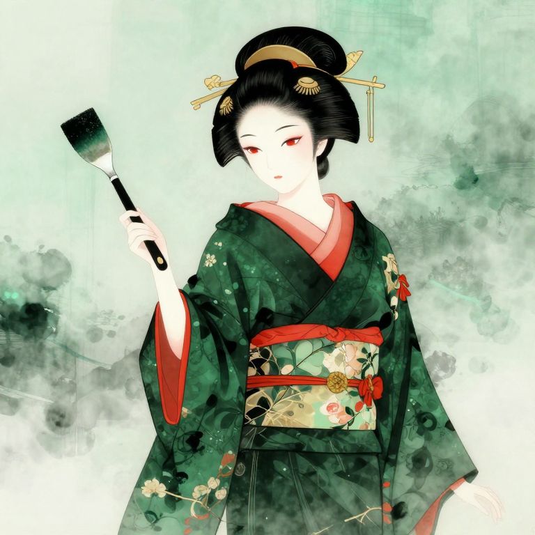 Applique a geisha poster, gorgeous in dark green and red style, anime aesthetic, made of mist, gongbi, heavy use of spatulas, light green and white,