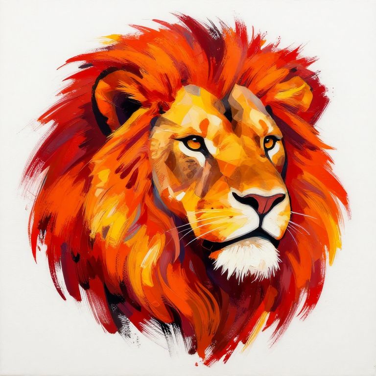 Lion head painting, artistic splash of color forming the shape of a powerful lion's head, vivid reds, oranges, and yellows, swirling brush strokes combined with geometric patterns, aura of strength and courage, modern abstract expressionism style on canvas.
