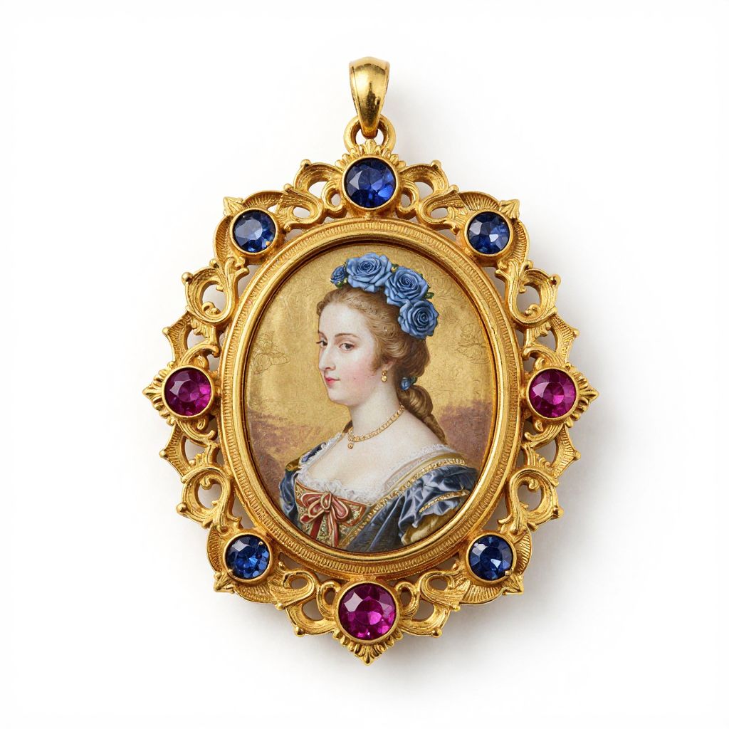 Exquisitely crafted 18th-century gold pendant featuring a miniature portrait of a woman adorned with blue roses, embellished with six sapphires and three rubies set within an ornate filigree frame.