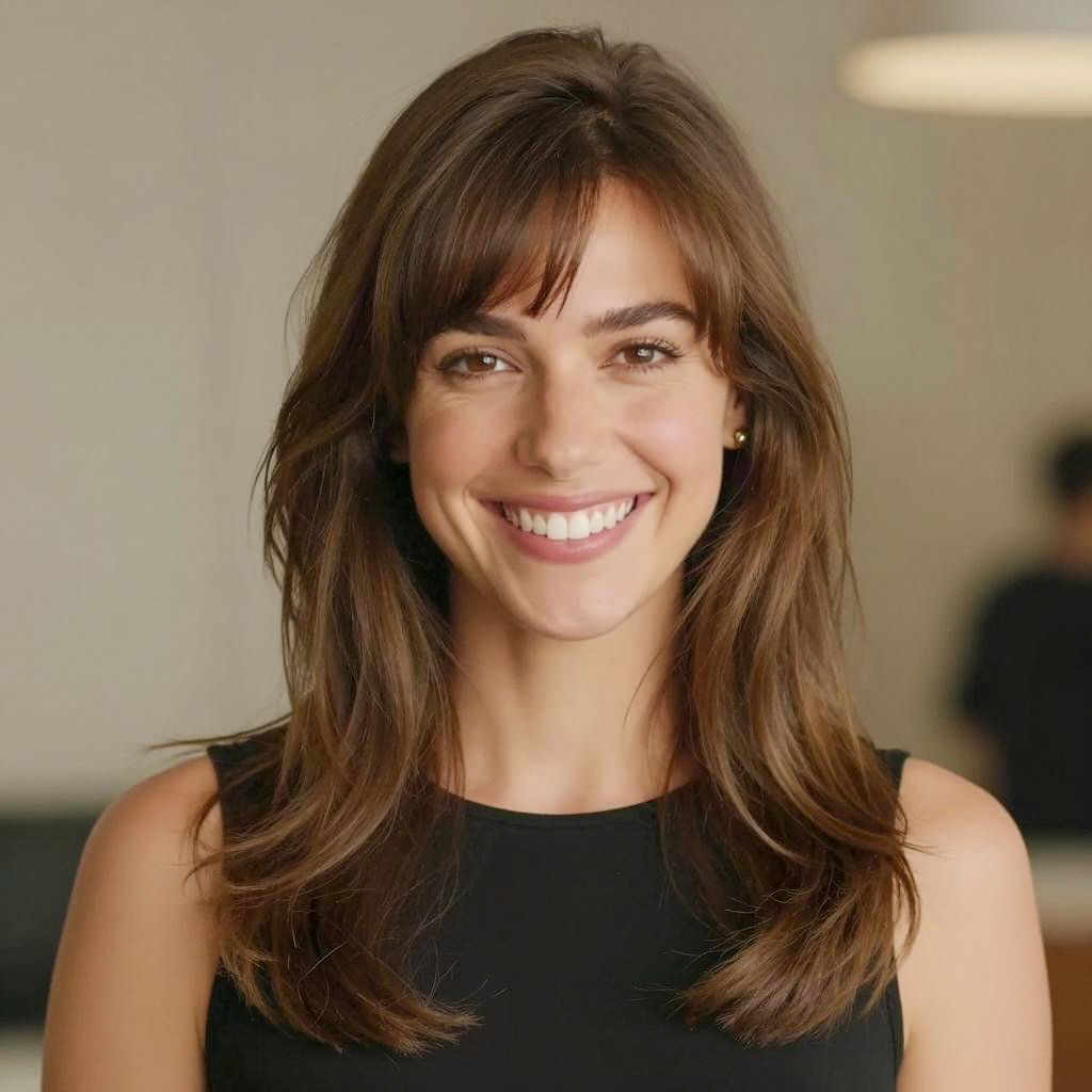Photograph of a smiling woman with short brown hair, light skin, and green eyes. She wears a light pink blouse with a V-neck. Background features blurred greenery and sunlight. She is centered, facing forward, with shoulders visible.