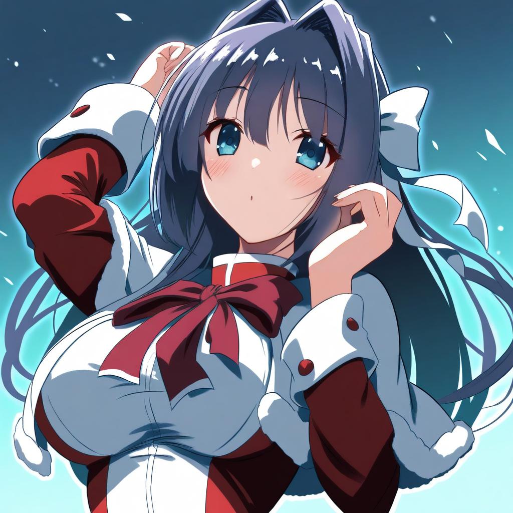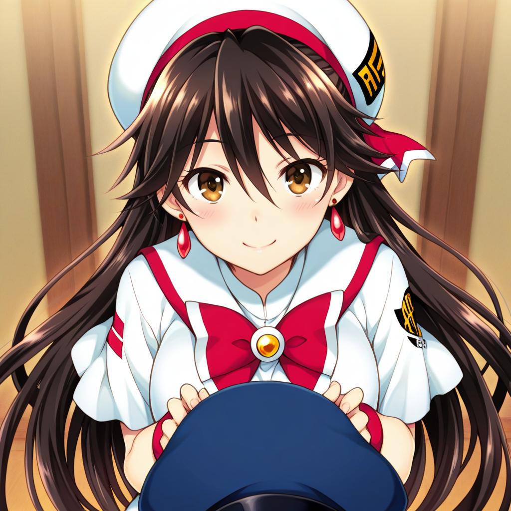 Close-up digital illustration of a young anime girl with long brown hair and brown eyes wearing a white and red Himeya Company uniform. She has a white hat with a red trim, red earrings, and a large red bow with a golden gem in the center. The girl is holding a blue object with both hands and is set against a simple, blurred background.