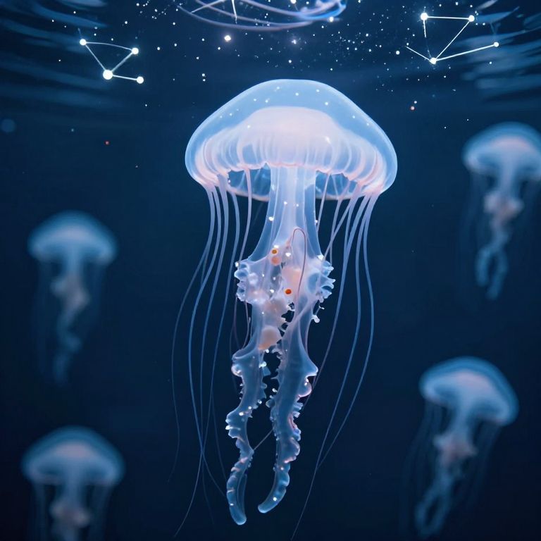Photograph of glowing, ethereal jellyfish with translucent blue and white bodies, floating in a dark, reflective ocean at night.