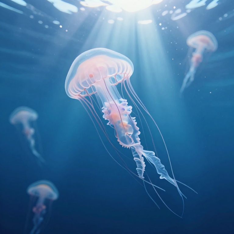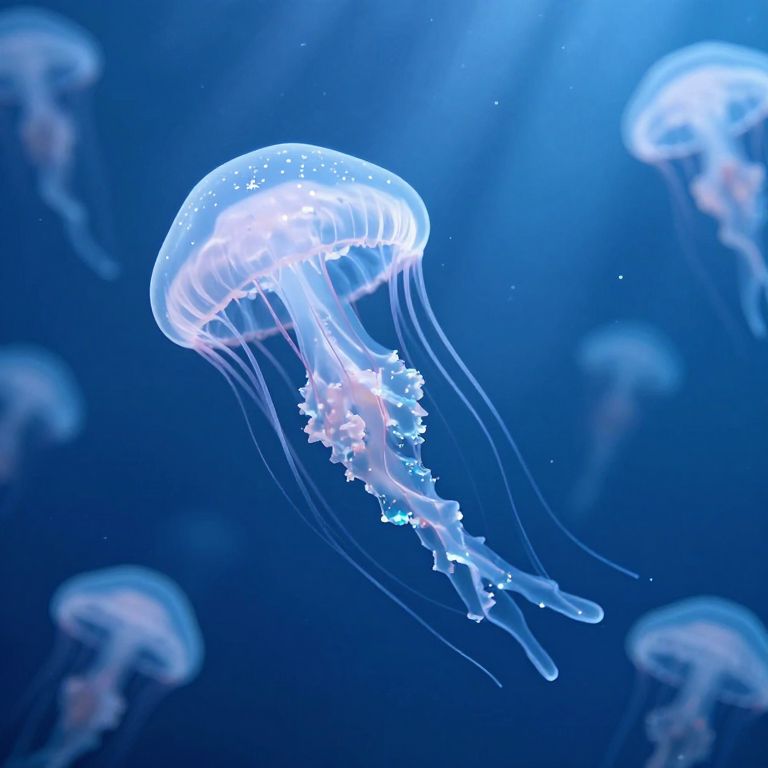 Glowing jellyfish with translucent crystalline bodies drift gracefully across a frosty lake, casting ethereal reflections and illuminating the icy surface with radiant trails of light.