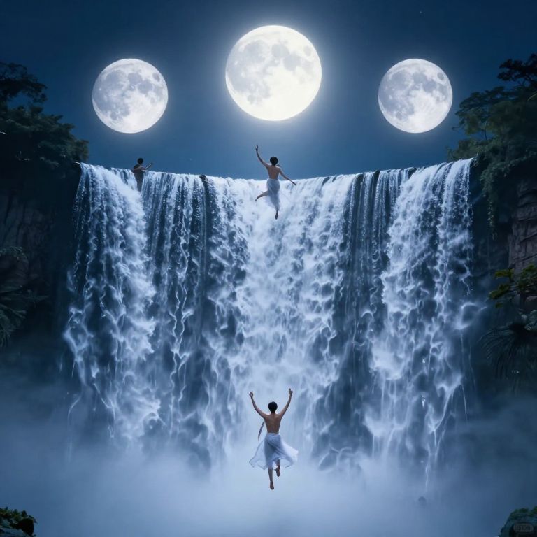 Digital artwork of a night scene featuring a massive, illuminated waterfall with three bright moons in the dark blue sky. Three people are on the waterfall: one stands at the top, arms raised, another is mid-fall with arms outstretched, and the third, in white clothing, jumps from the bottom. The waterfall's cascading water glows with a blue-white light, creating a misty effect at the base. Trees frame the sides of the waterfall, adding depth to the scene. The overall style is fantastical and dramatic, emphasizing the surreal beauty and power of the waterfall.