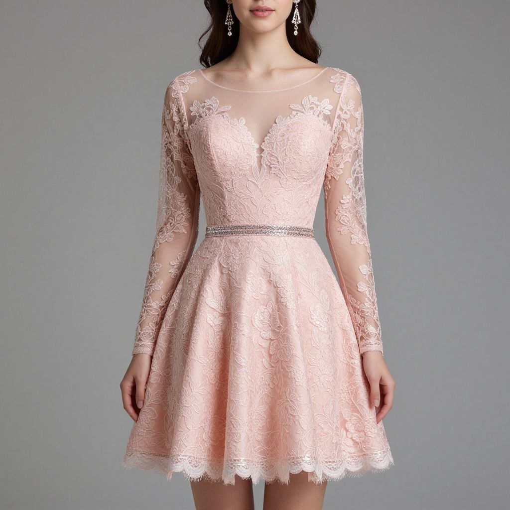 Elegant woman showcasing a long-sleeve pink lace short homecoming prom dress featuring intricate floral embroidery, a sheer bodice, and a shimmering waistband, paired with dangling earrings against a neutral backdrop.