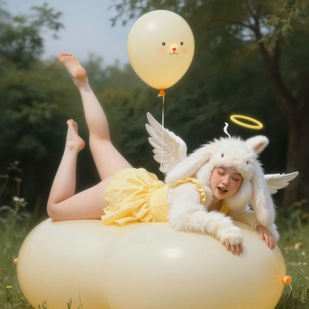 Photograph of a young Asian woman with fair skin, lying on a large, white, balloon-like object in a lush, green outdoor setting. She wears a white, fluffy angel costume with a halo and small wings, and a yellow, ruffled skirt. Her legs are playfully raised in the air. A glowing, yellow balloon with a cute, smiling face floats above her head. The background features blurred trees and grass, adding a serene, natural ambiance. The woman's expression is joyful, with a slightly open mouth. The image is brightly lit, enhancing the whimsical, playful theme.