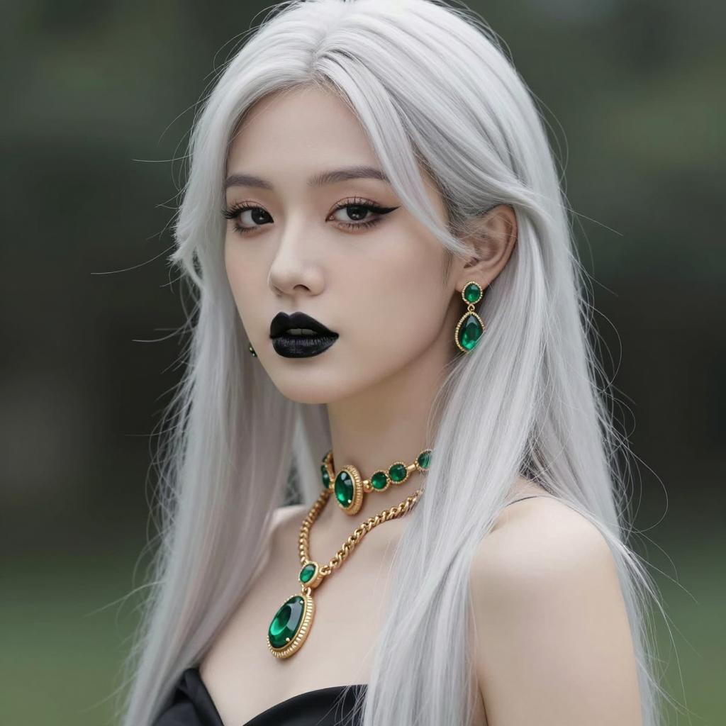 Woman with pale skin, dark makeup, and black lipstick lies on a stone slab. She has long black hair with blue streaks, wears a black top, and holds a cigarette in her right hand. Several rings adorn her fingers. Her dark eyes are slightly open, and her expression is neutral. Grass and fallen leaves are on the ground. She wears multiple black bracelets on her left wrist. The stone slab has an ornate design at the top.