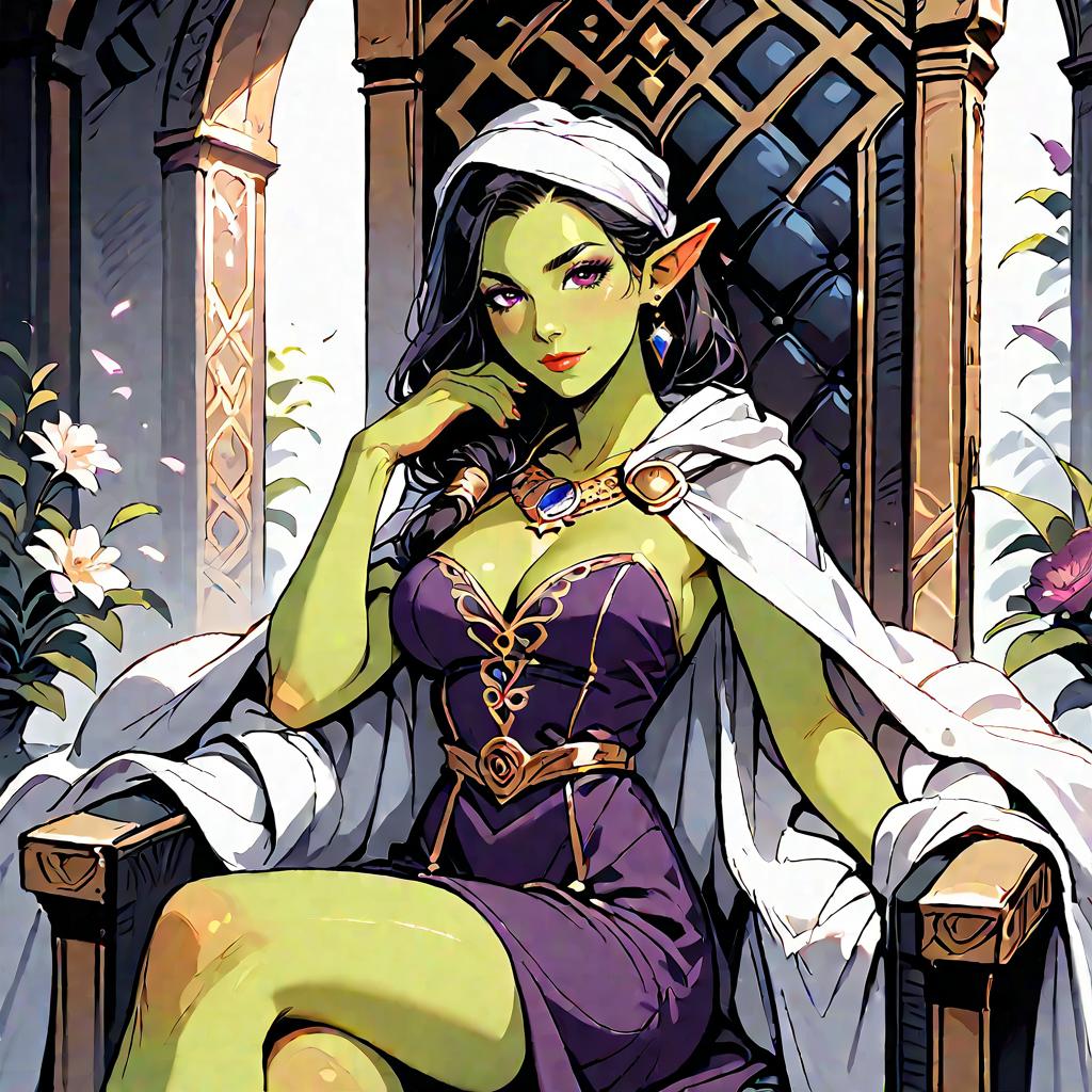 Digital artwork of a bold fantasy elf princess sitting on a throne with green skin, pointy ears, and black eyes. She wears a luxurious purple dress with gold details, a white turban, and a white cape. The setting features a dark, eerie dungeon backdrop with flowers nearby. The princess has a confident expression with a slight grin, crossing her legs elegantly.